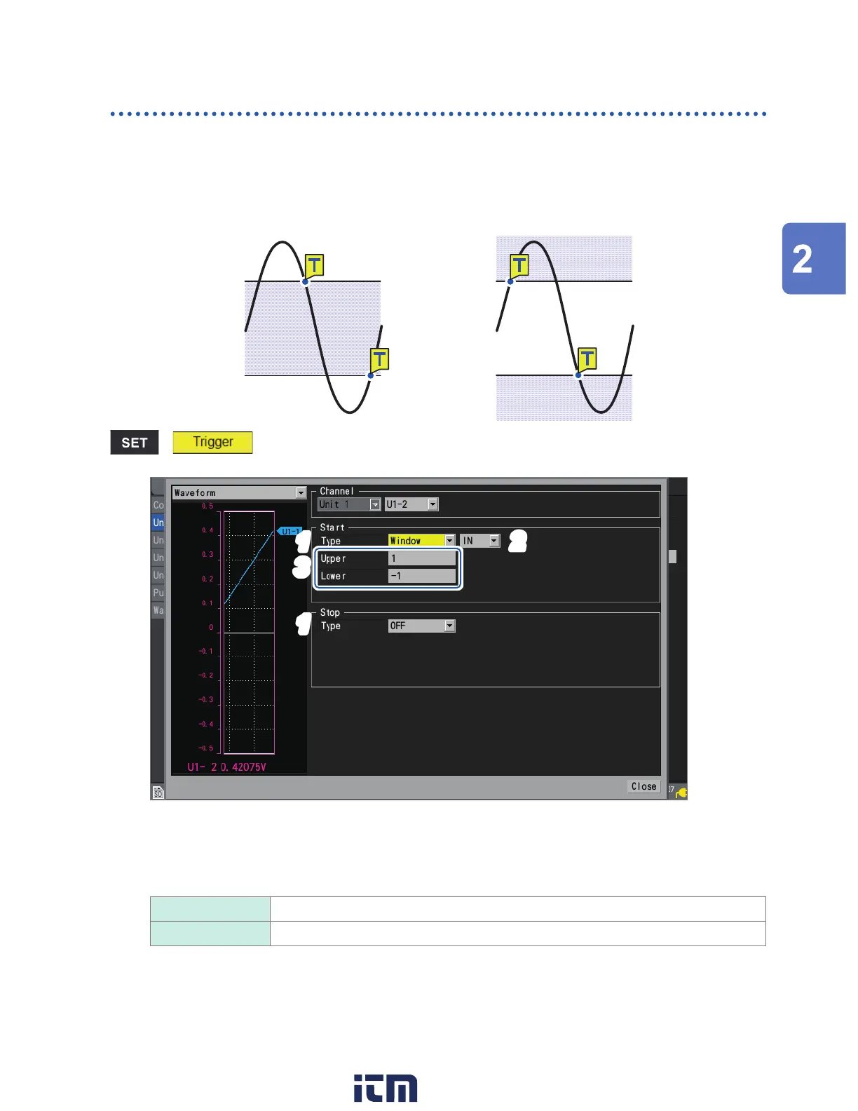 Under [Type] for [Start] or [Stop], set the trigger type to [Window].