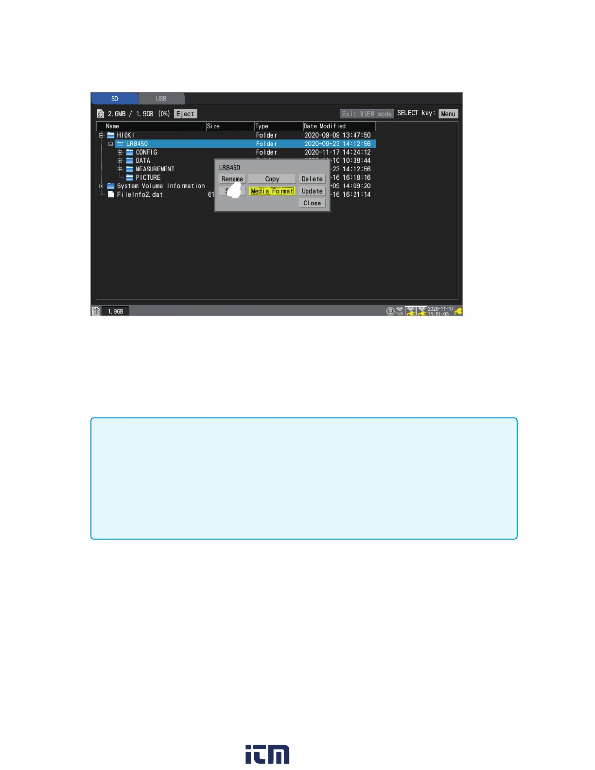 another format (NTFS, etc.), the instrument will not recognize the device.
