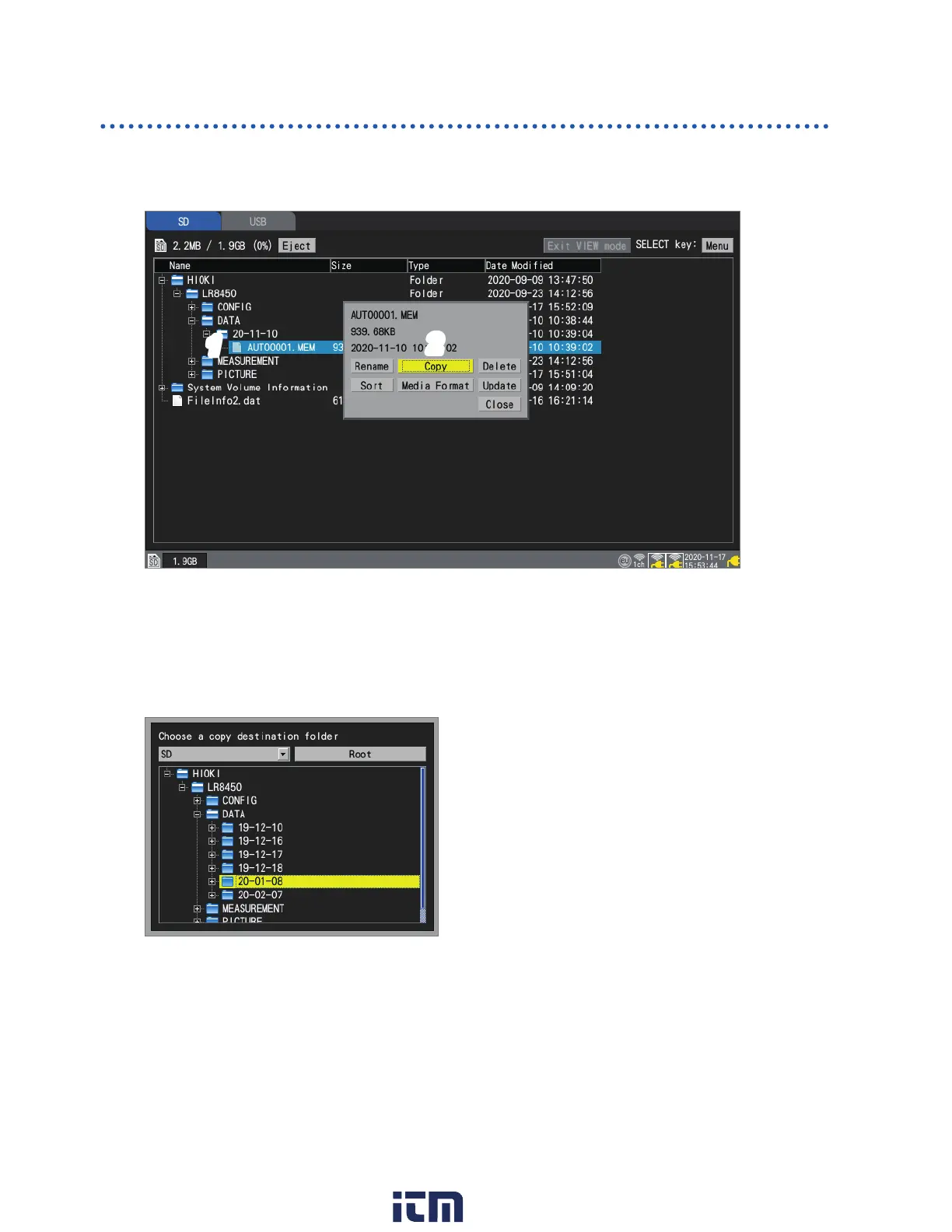 This section describes how to copy data and folders between an SD Memory Card and a USB