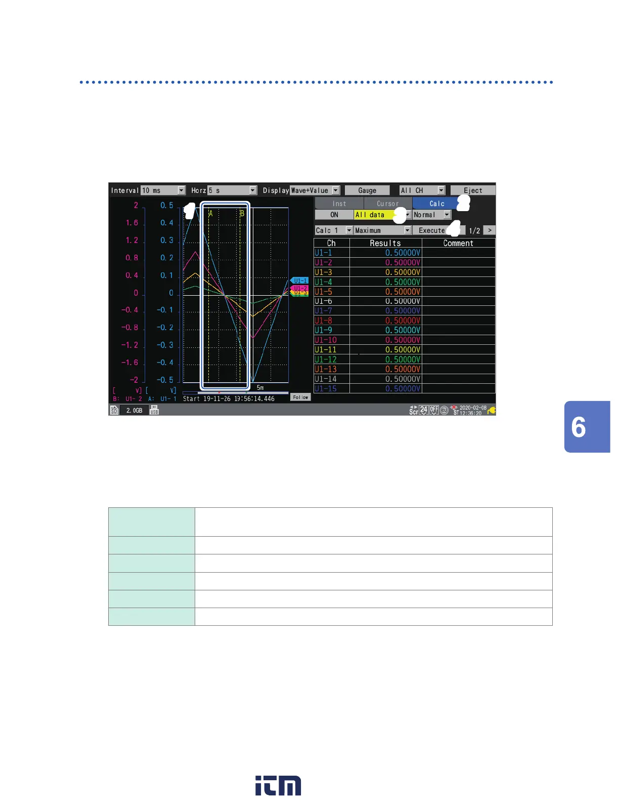The numerical calculation will be performed after the range has been specied with the A/B cursors