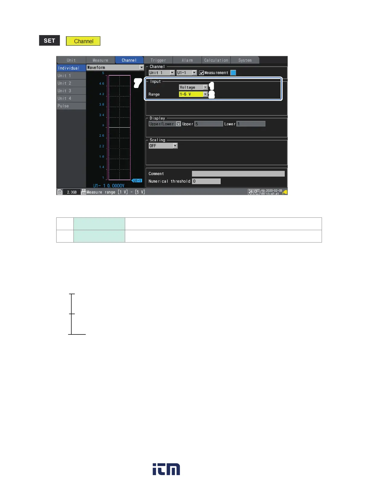 The 1-5 V range is a range in which the 10 V range’s display range lower and upper limits are set to 1 V and 5 V,