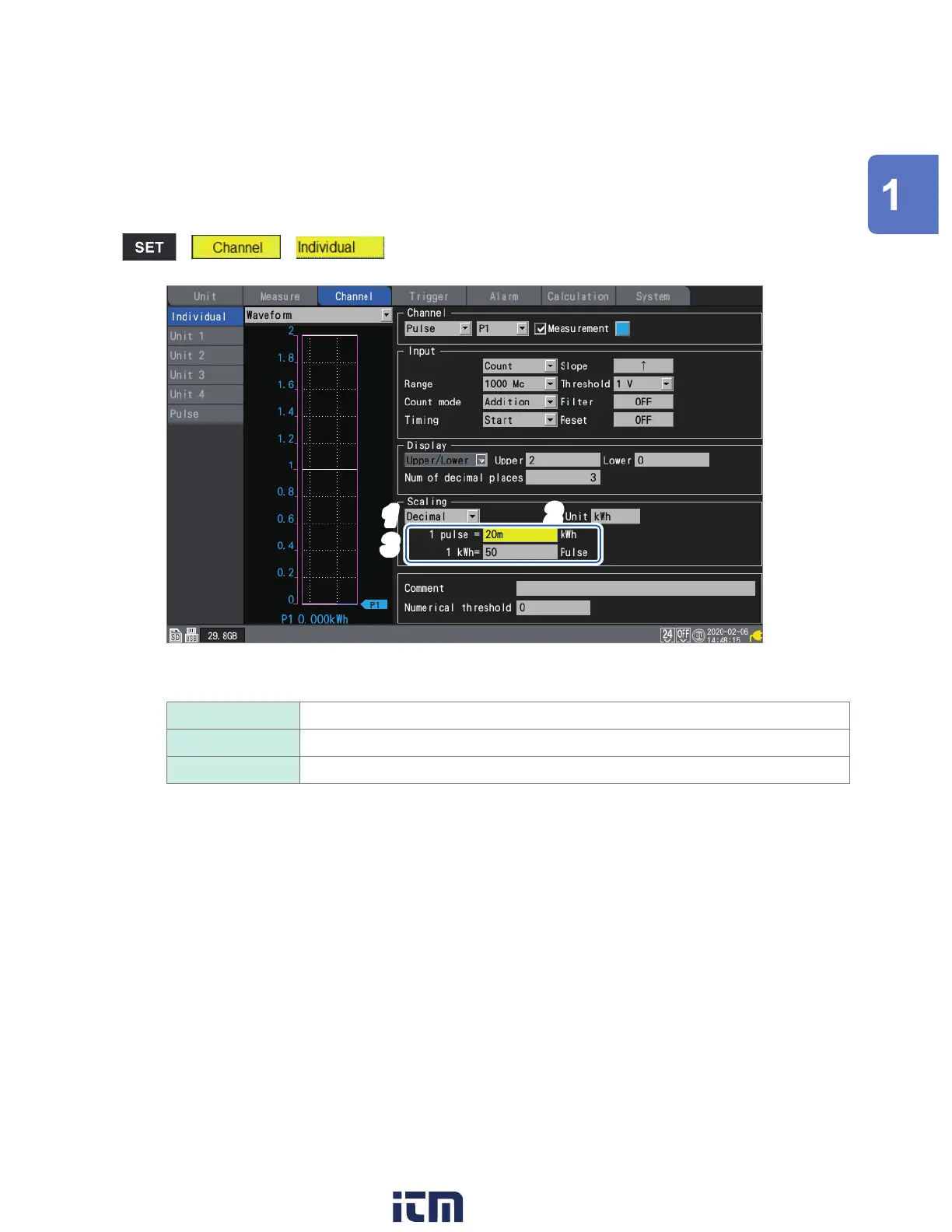 You can use the scaling function to convert the integrated pulse count to the measurement target’s