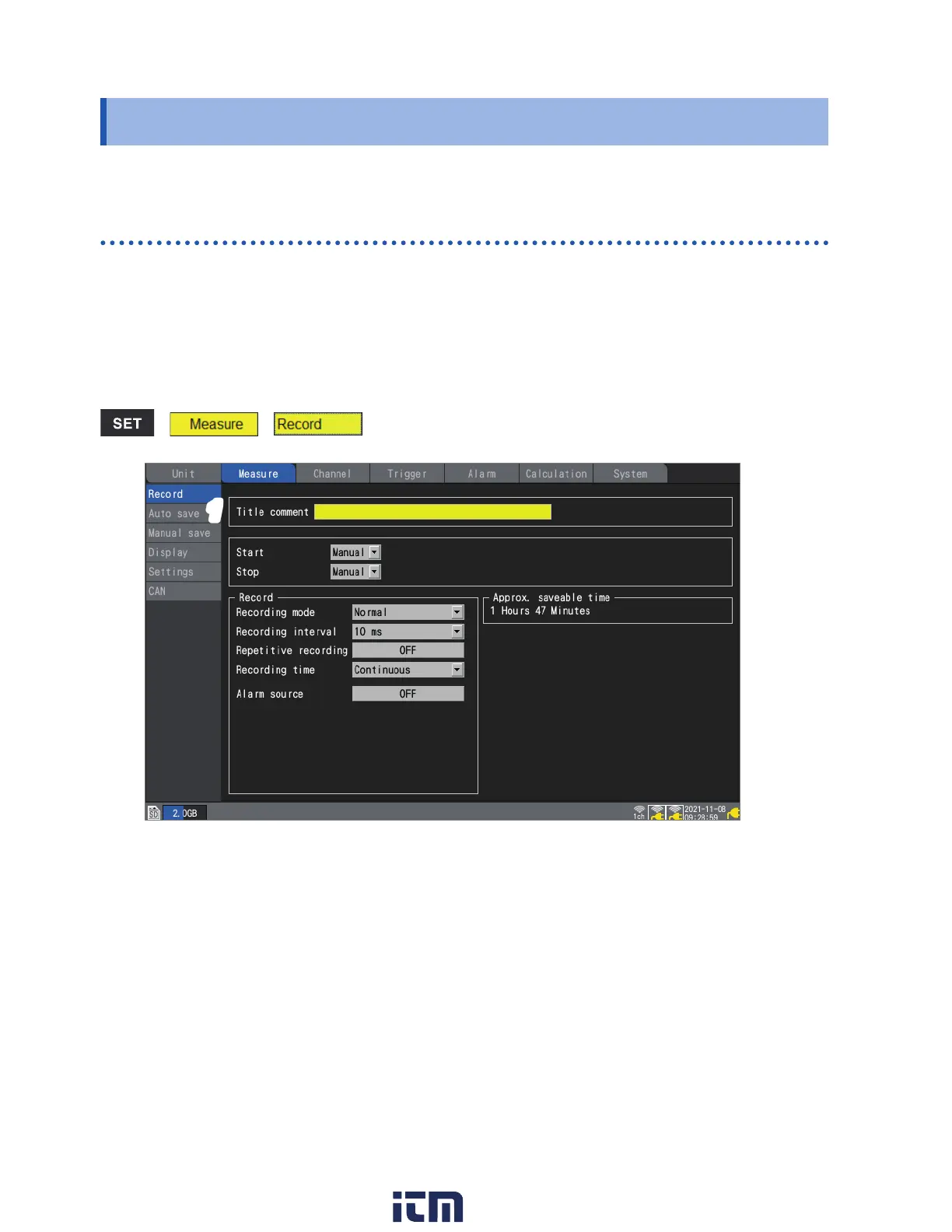 This section describes how to enter measurement titles, channel comments, and module identiers.