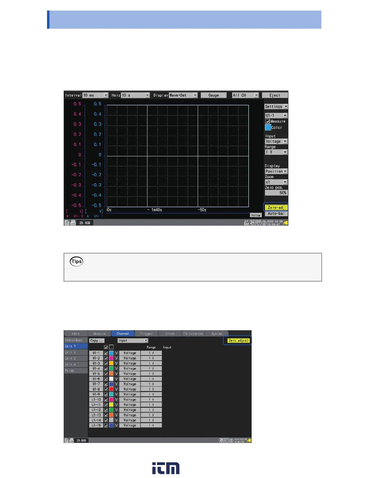 Press the ENTER key while [Zero-adj] is selected on the waveform screen.