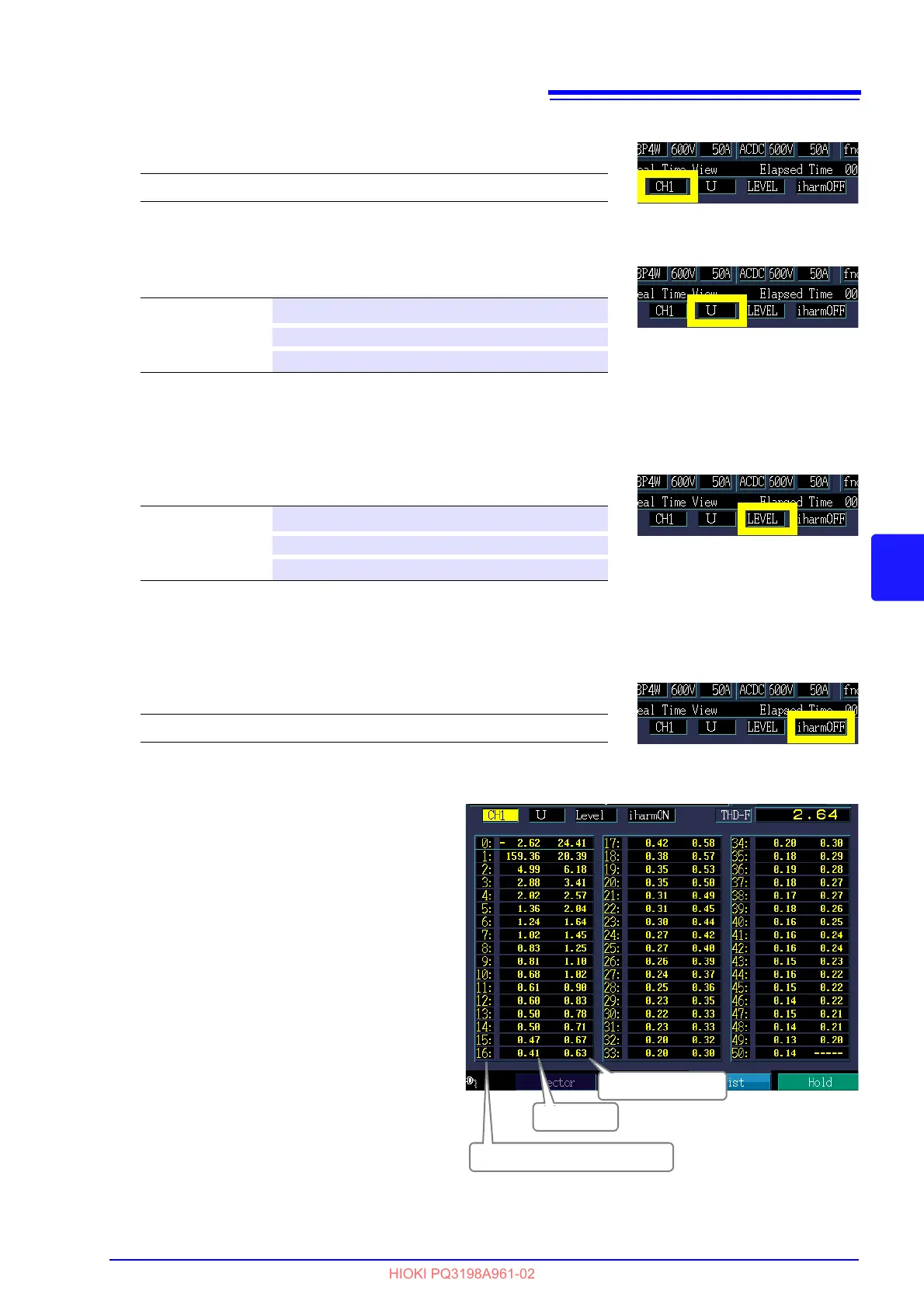 Select the harmonics list display (RMS value display, phase angle display, or content percentage).