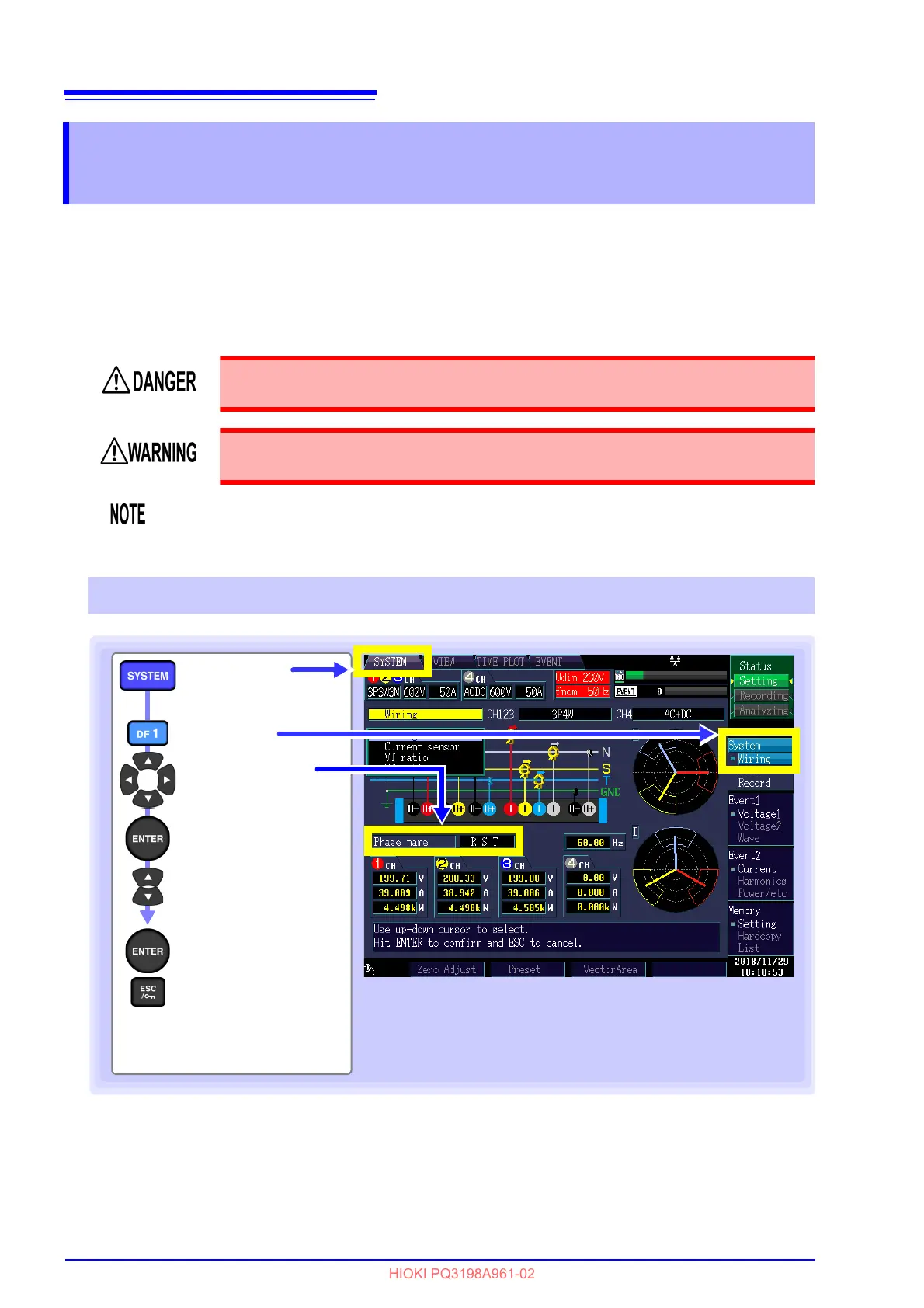 Connect the voltage cords and current sensors to the measurement line as shown in the connec-