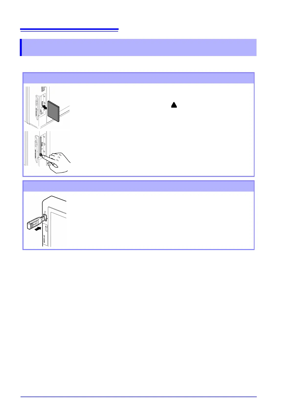 Insert and remove CF cards and USB flash drives as follows.