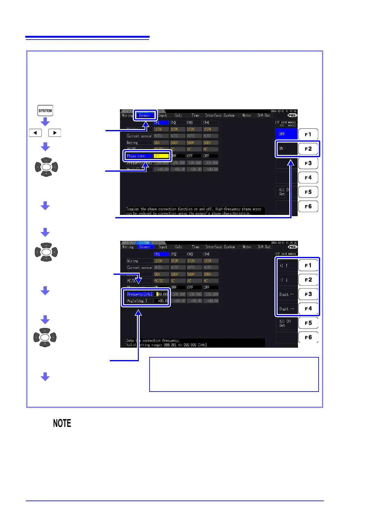 • Set the frequency and phase difference as appropriate for the current sensor in use.