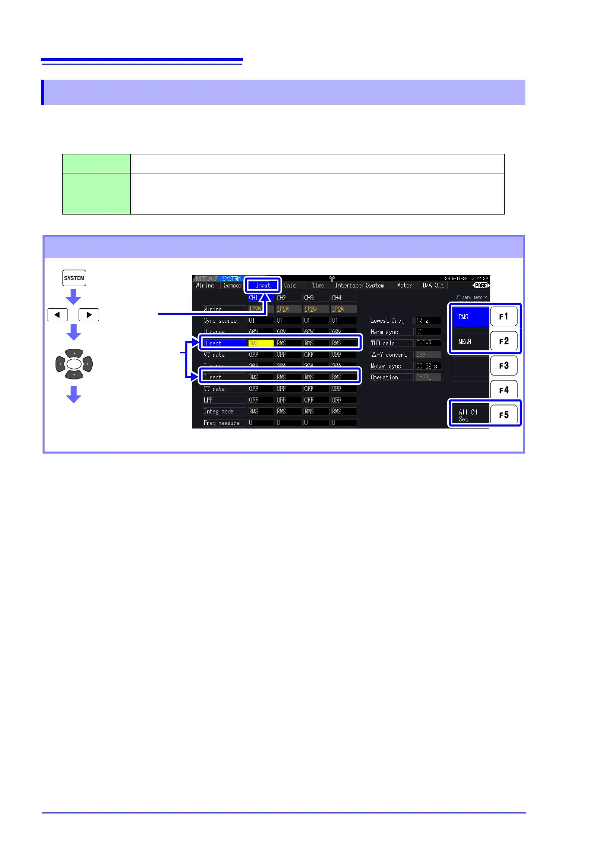 [MEAN] and [RMS] settings for each range are made on the [CH] pages.