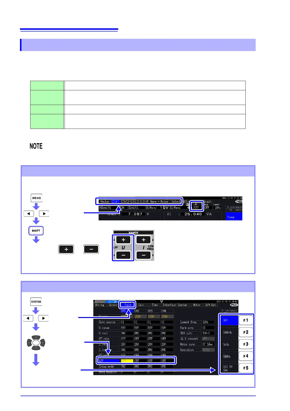 The low-pass filter setting appears below [LPF] on the Measurement screen.