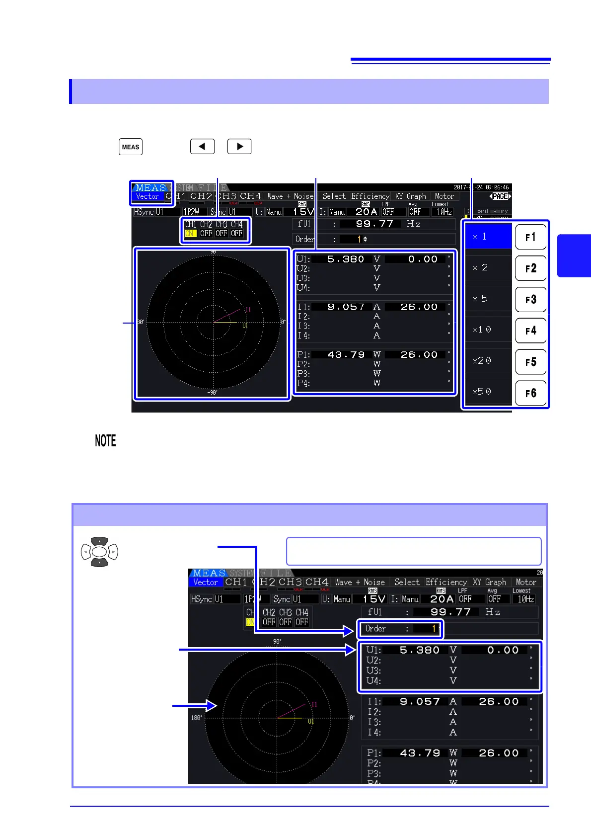 phase relationship between voltage and current. Numerical values for the selected order are also displayed.