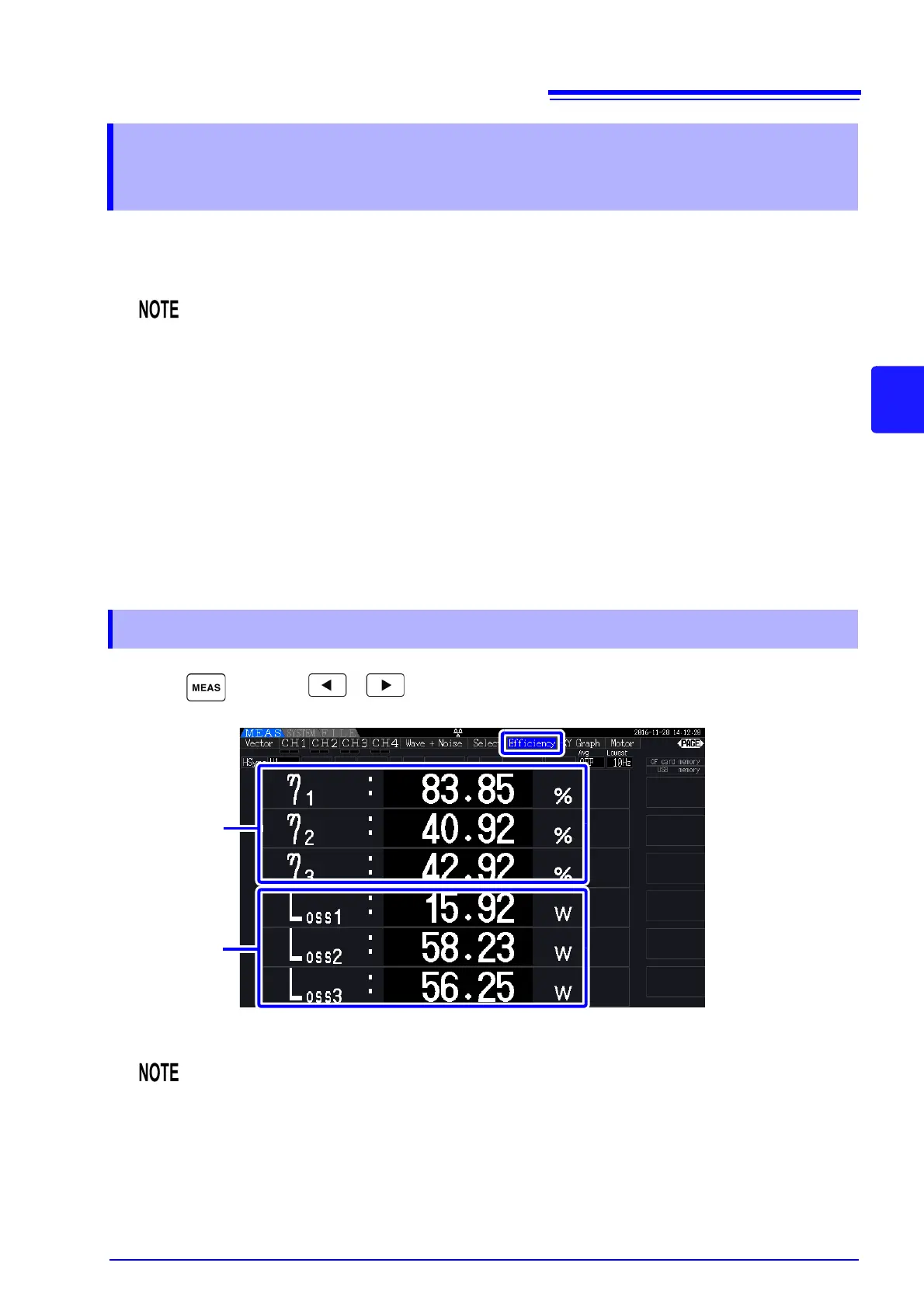 This instrument uses active power and motor power values to calculate and display efficiency ( [%]) and