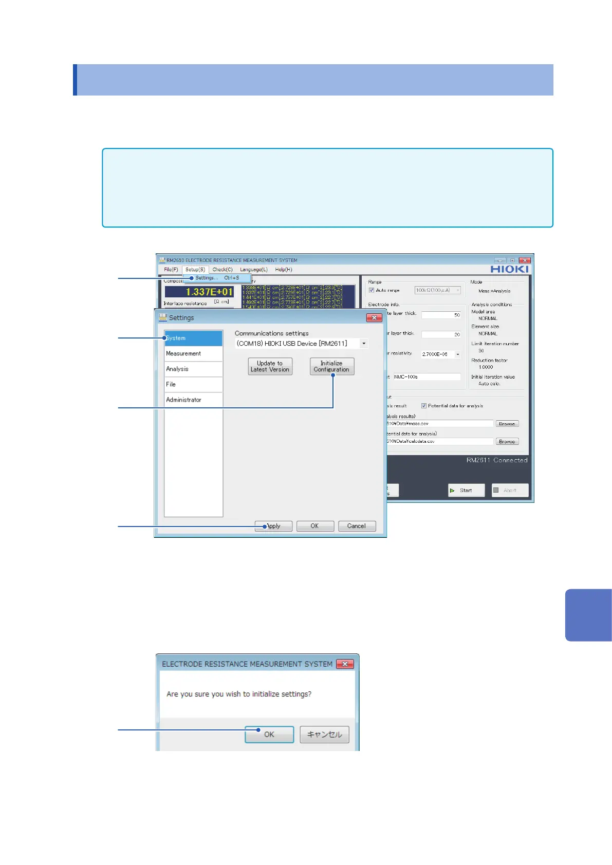 Follow the instructions in “6.1 Saving Measurement Conditions” (p. 73) as necessary before initializing the