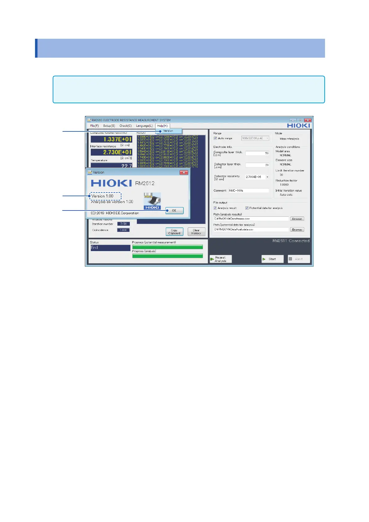 The dialog box displays the version of the PC application and the version of the analysis