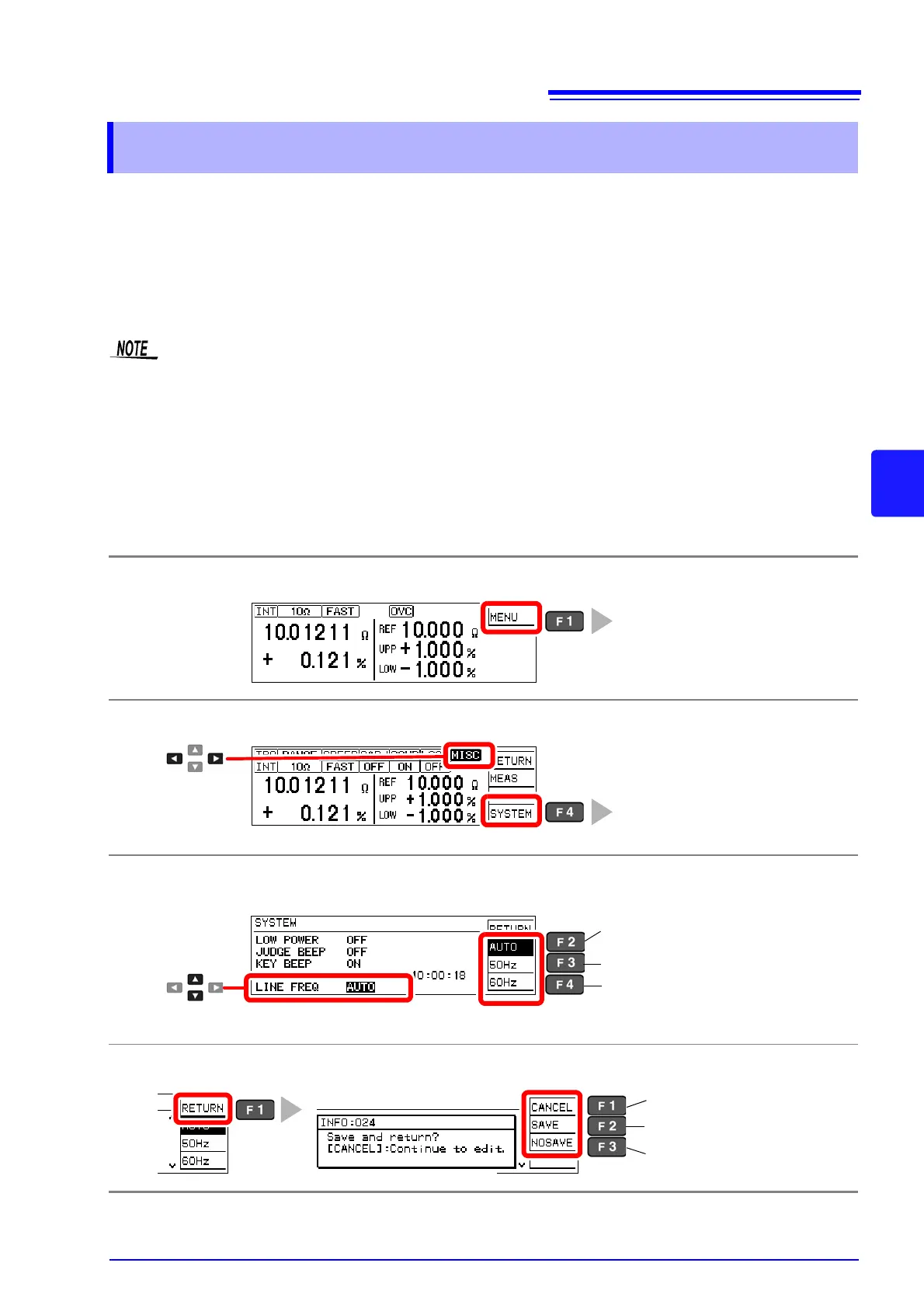 When the AUTO setting is selected, the line frequency is automatically set to 50 or 60 Hz when the instrument