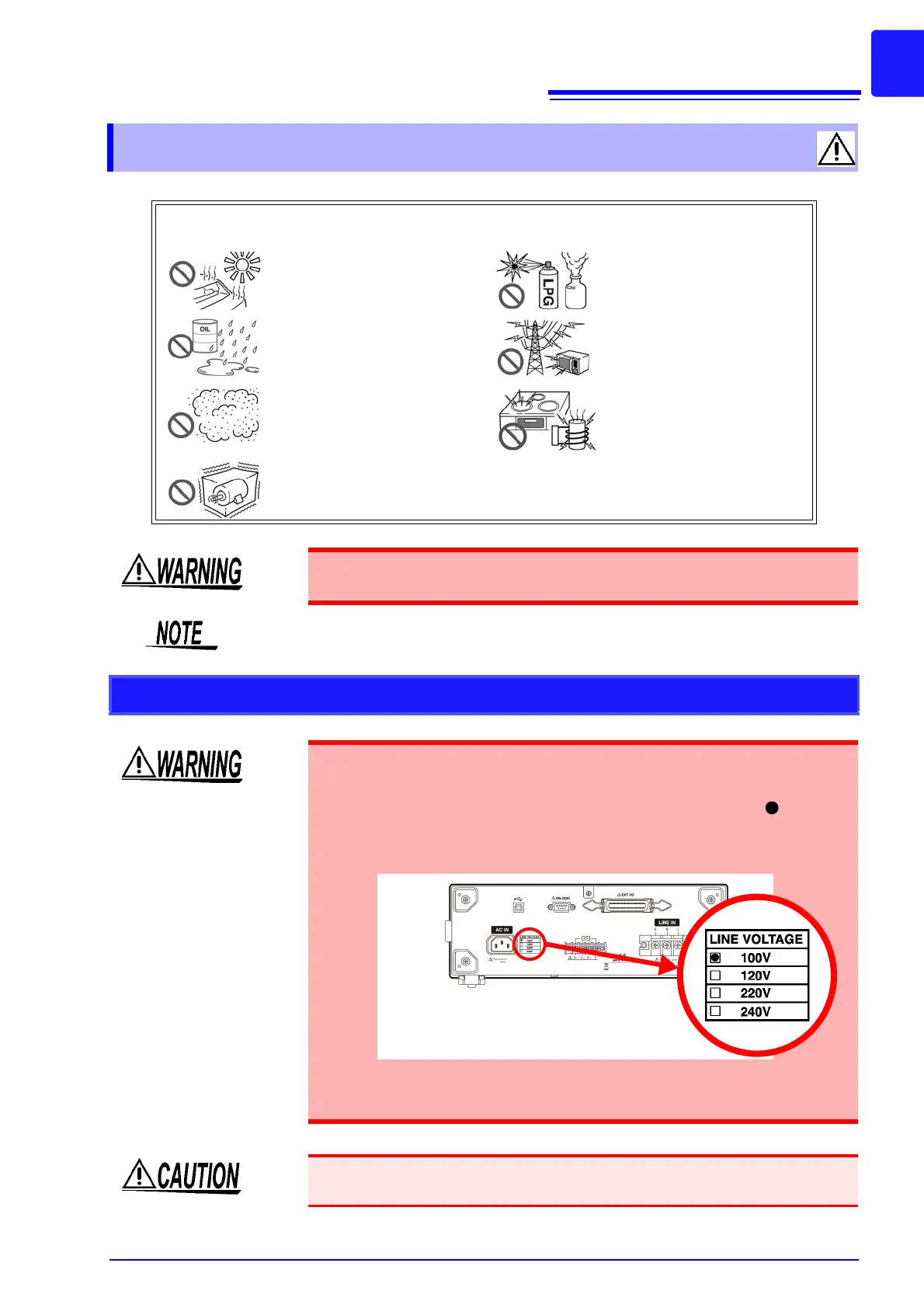 • Before turning on the instrument, confirm that the voltage of the power