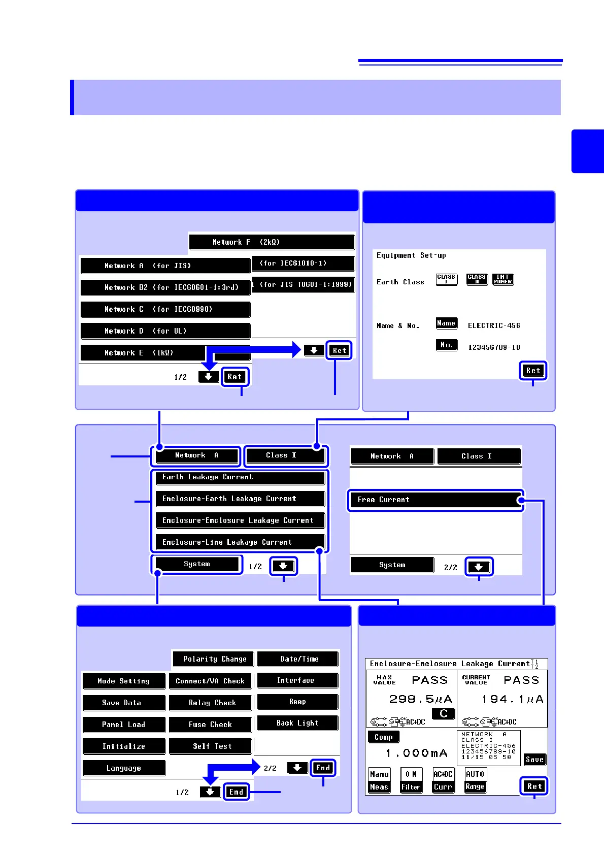 measurement mode keys, selecting network B1 opens three initial screens and selecting B2 opens four