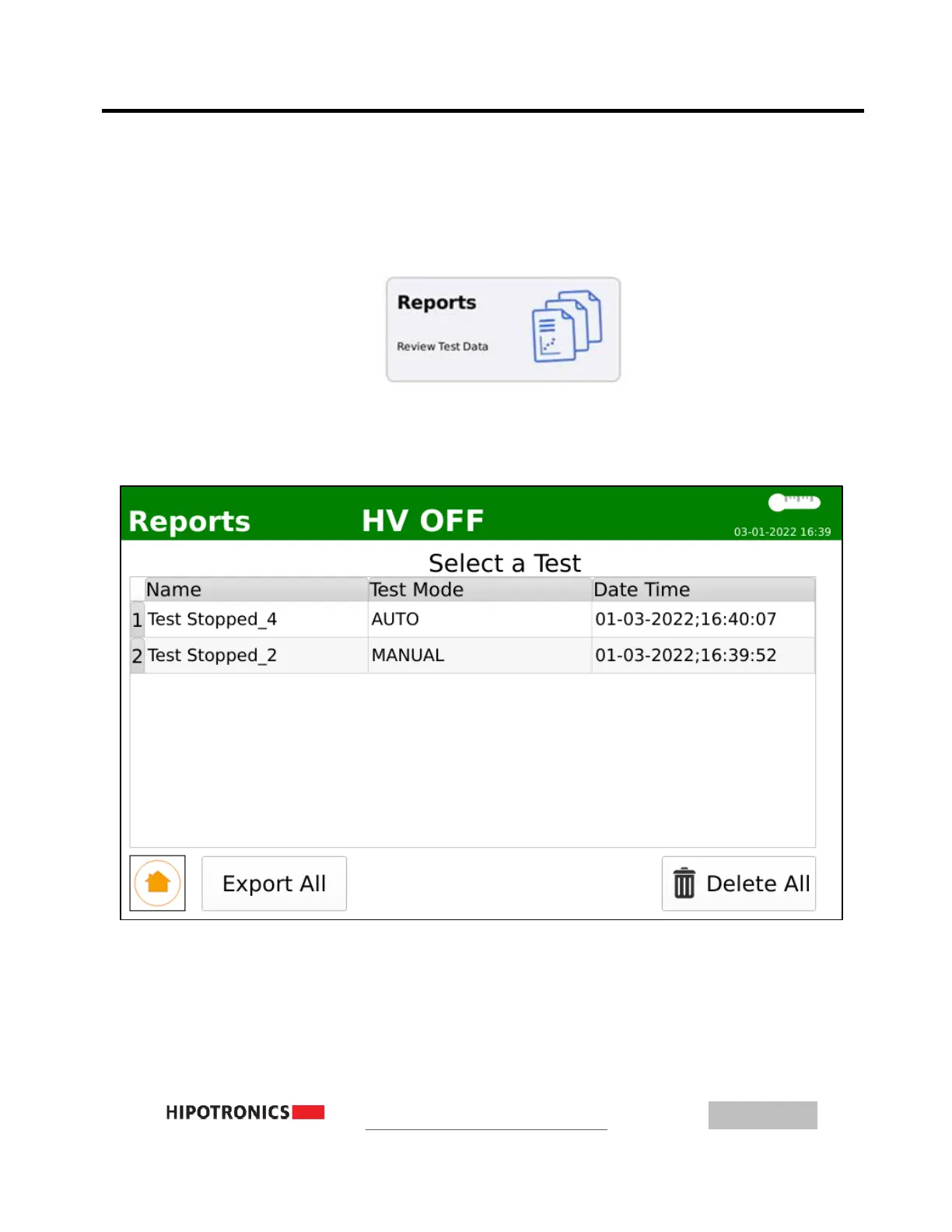 Test reports can be accessed from the main menu by touching the ‘Reports’