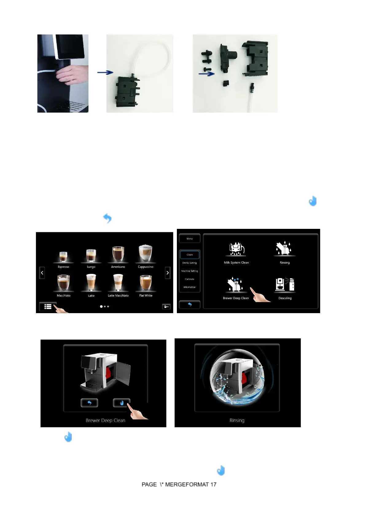 Step 1: Touch Main Menu Icon and choose menu setting-Clean-Brewer Deep Clean, touch to