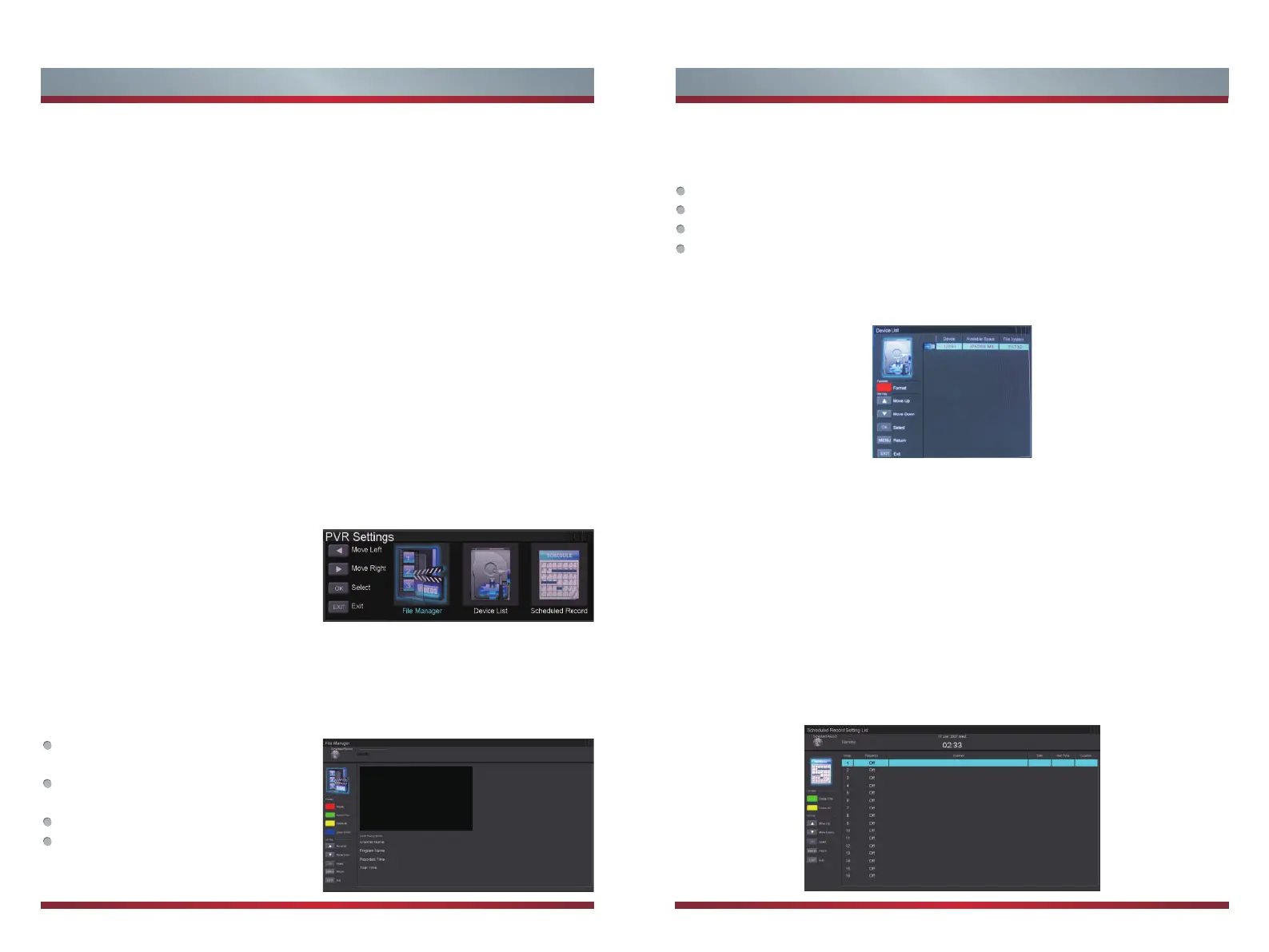 To enter to PVR Setting submenu (File Manager, Scheduled Record, and Device List):