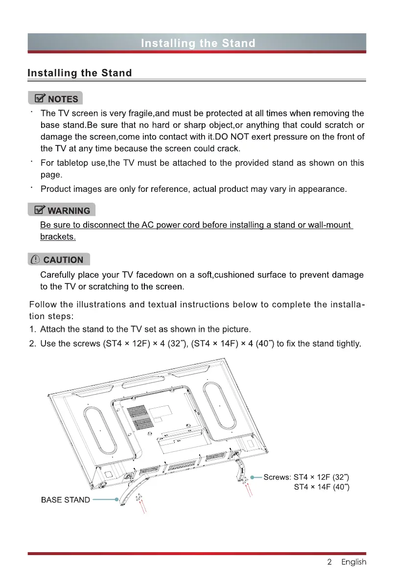 Hisense 32M2160 - Installing the Stand; Base Stand Installation