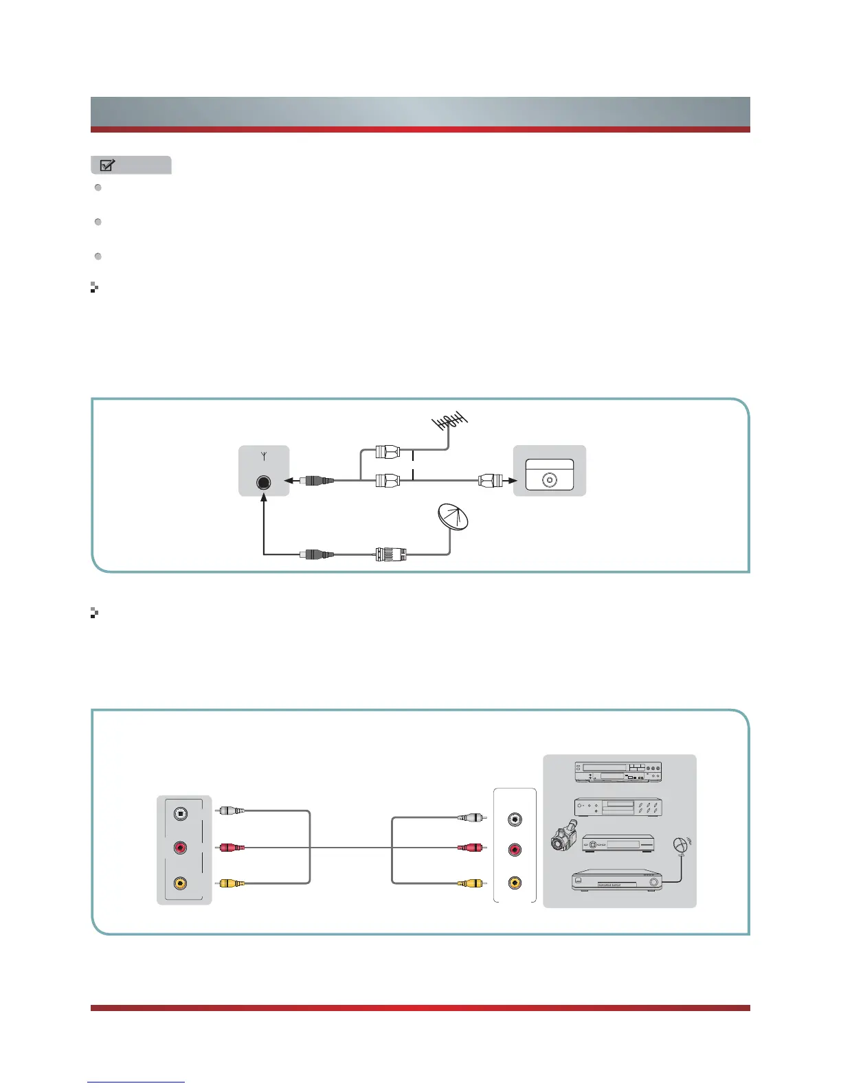 1. Use the audio and video cables to connect the external A/V device’s composite video/audio jacks to the TV’s jacks. (Video =