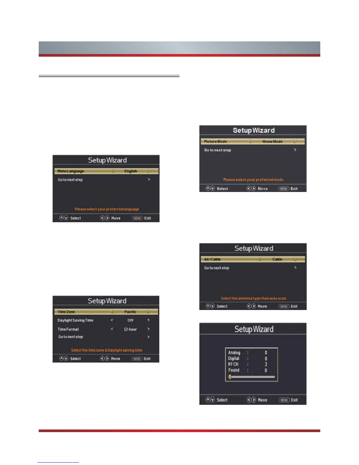 The Initial Setup menu appears the first time you turn on the