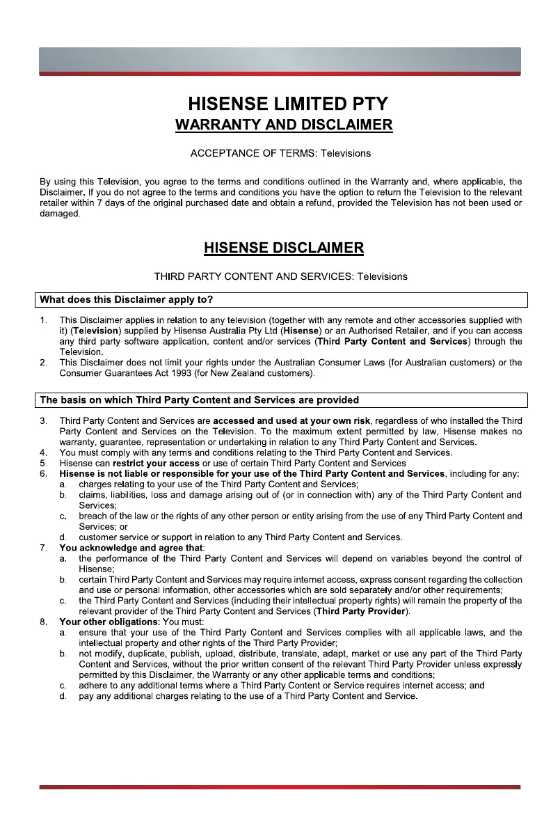 Hisense 65R8 - Warranty and Disclaimer; Hisense Disclaimer Terms