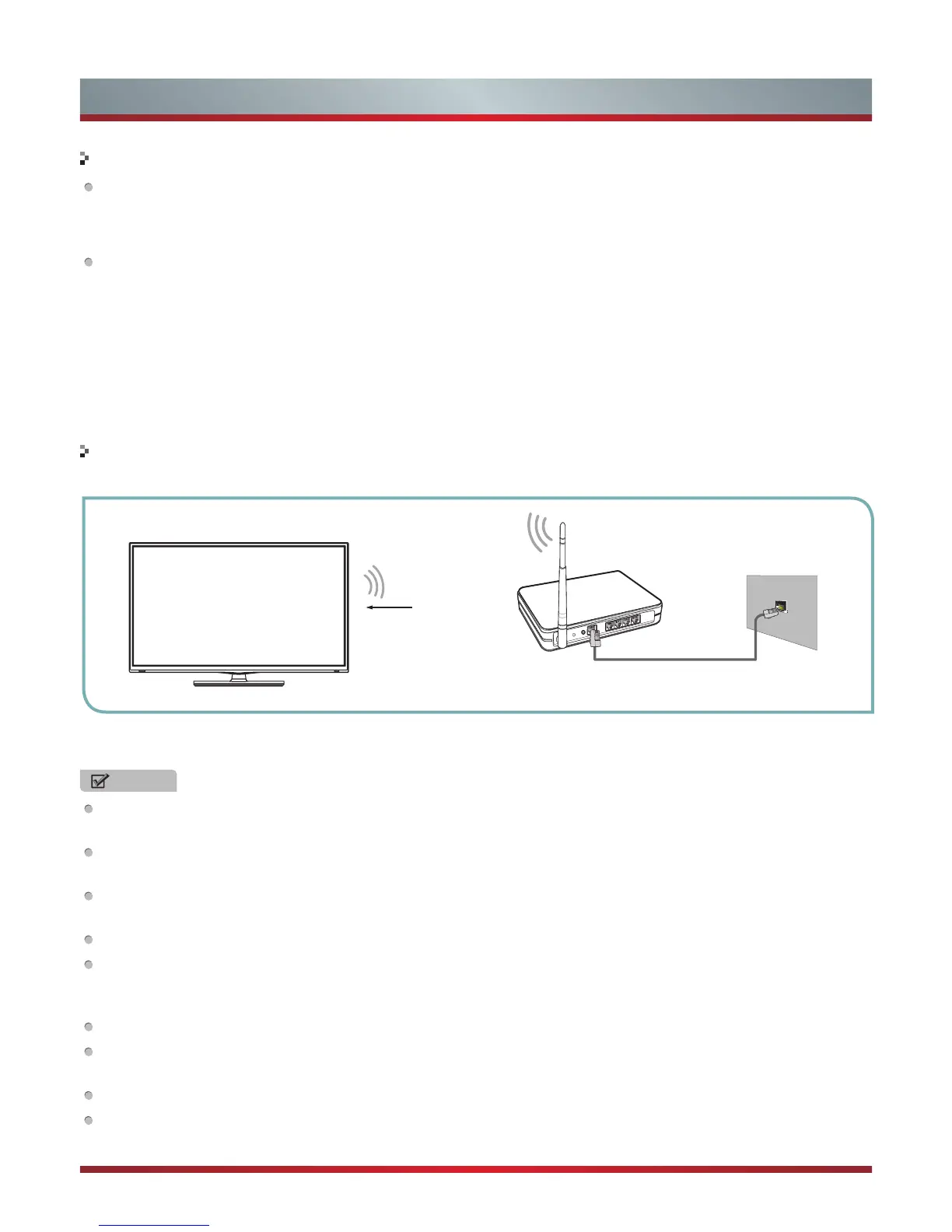 To connect your TV to your network wirelessly, you need a wireless router or modem. See the illustration below.