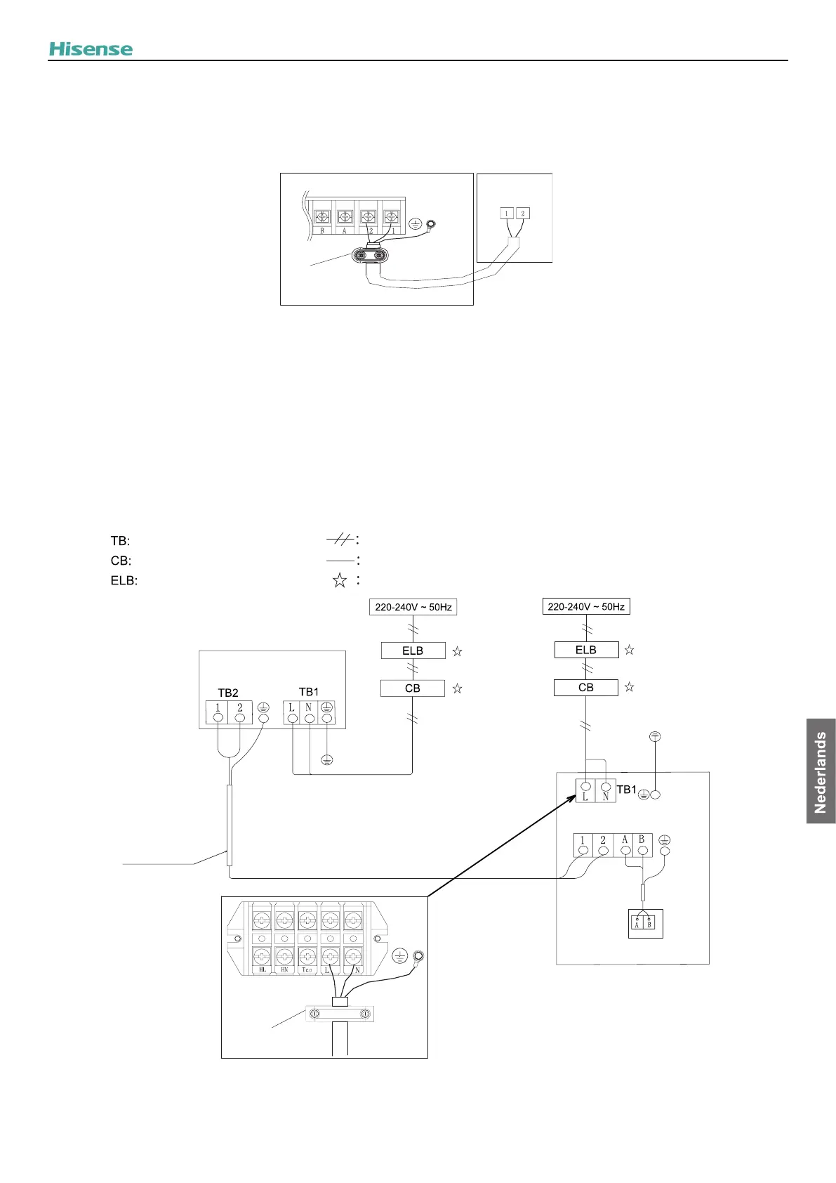 De hoofdvoeding is als volgt aangesloten op de aansluitklemplaat (TB1):