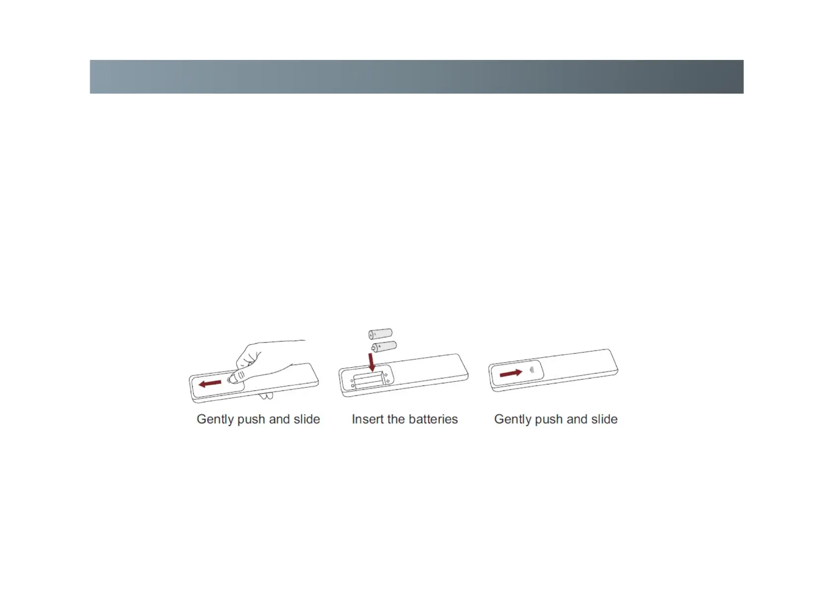 • Slide the back cover to open the battery compartment of the remote control.