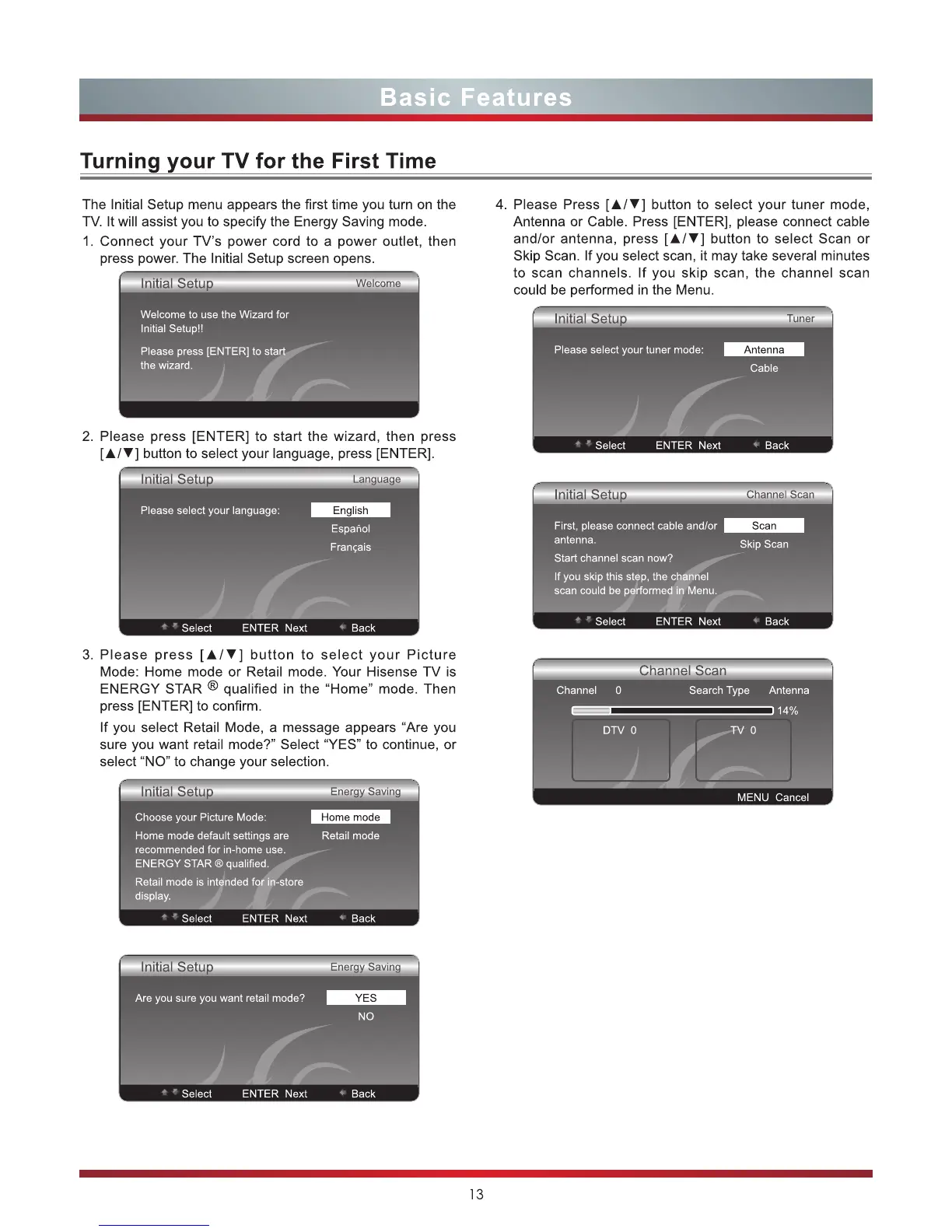 Hisense F46K20E - Basic Features: Initial TV Setup; Initial TV Setup Wizard