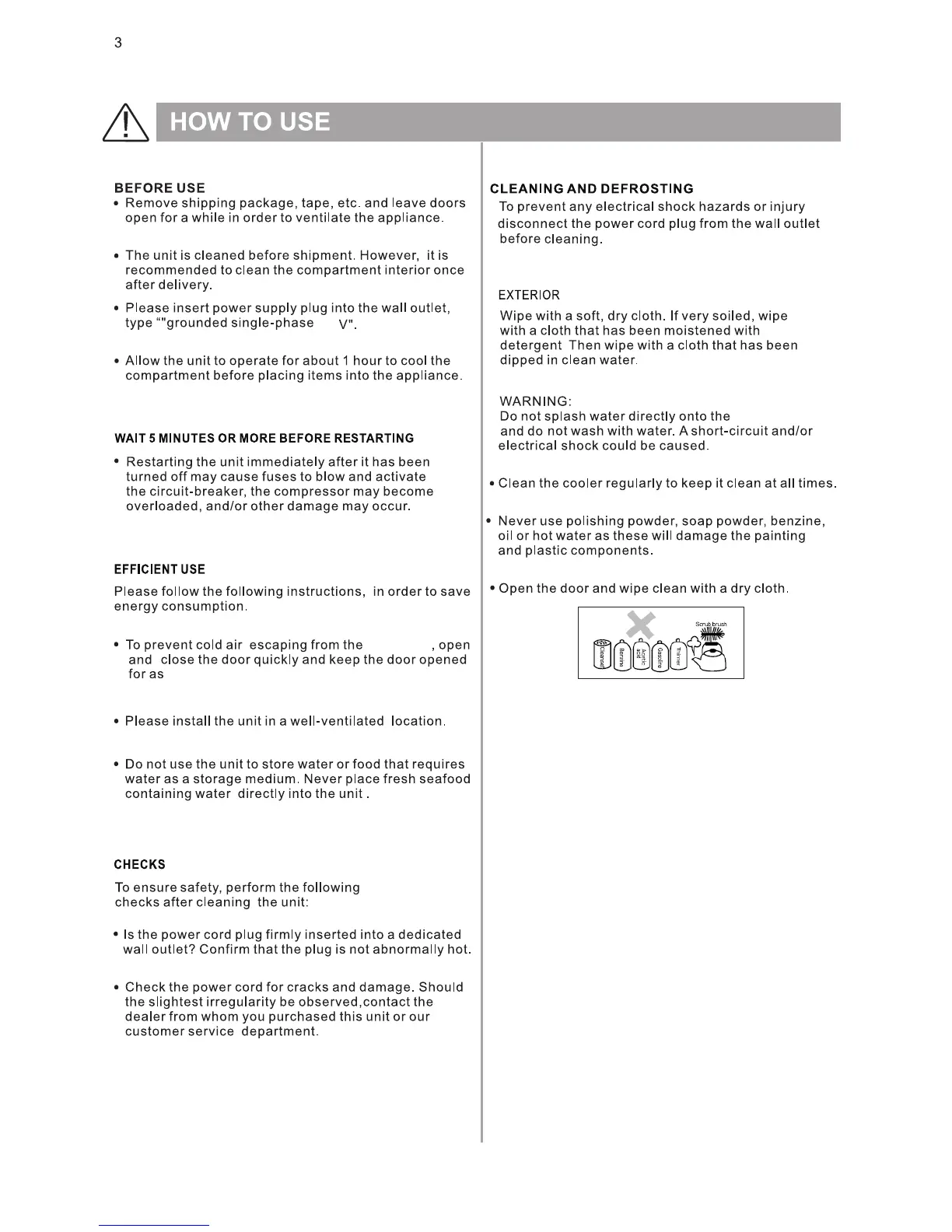 Hisense fc72d6bwe - How to Use; Before Use; Wait 5 Minutes or More Before Restarting; Cleaning and Defrosting