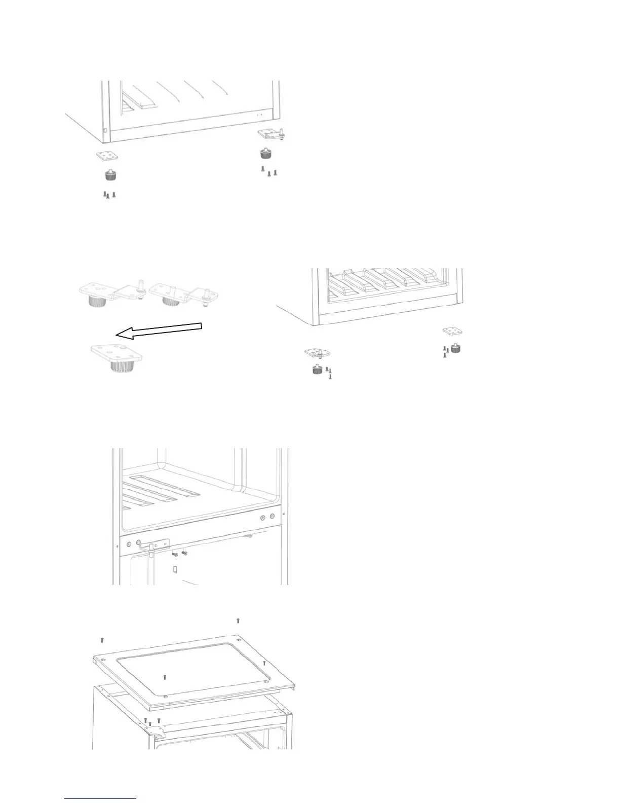 6. Remove both adjustable feet and remove the bottom hinge bracket by unscrewing
