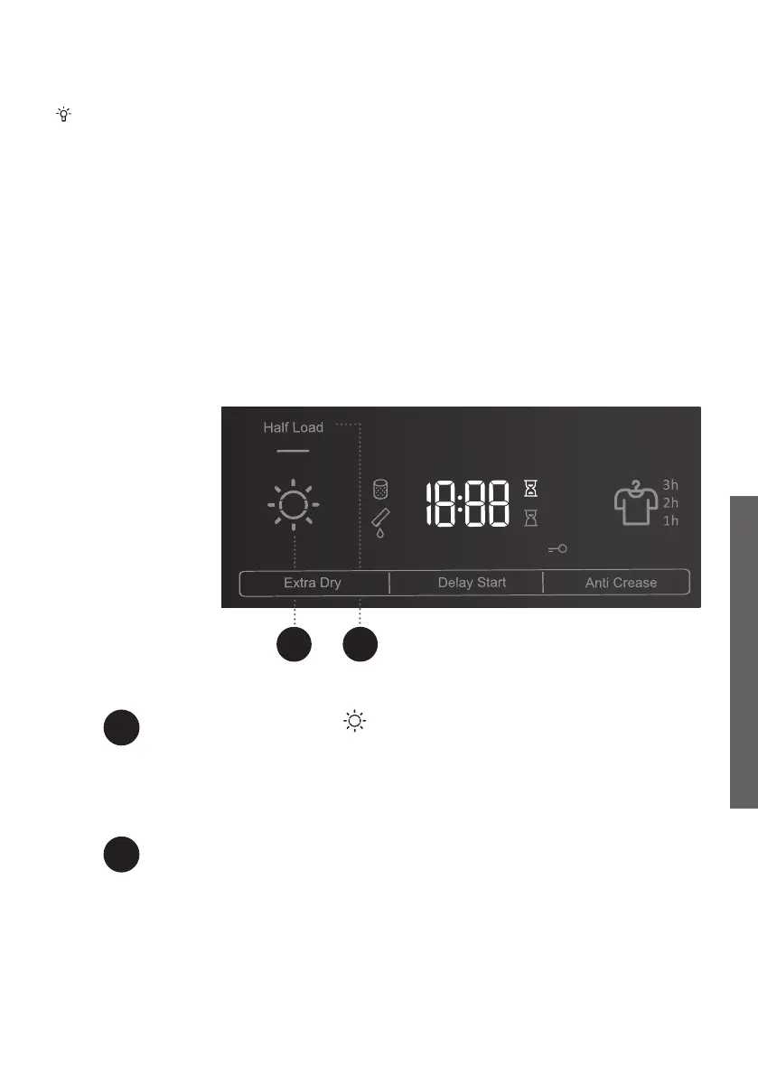 Functions that can be changed or adjusted with the selected drying programme are partly lit