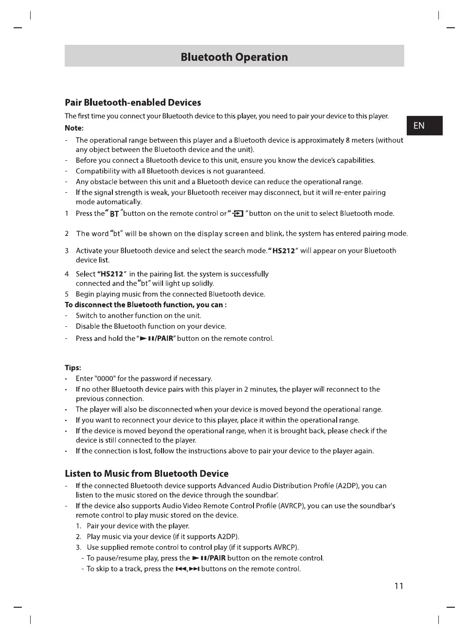 Hisense HS212 - Bluetooth Operation; Pairing Bluetooth Devices; Bluetooth Audio Playback