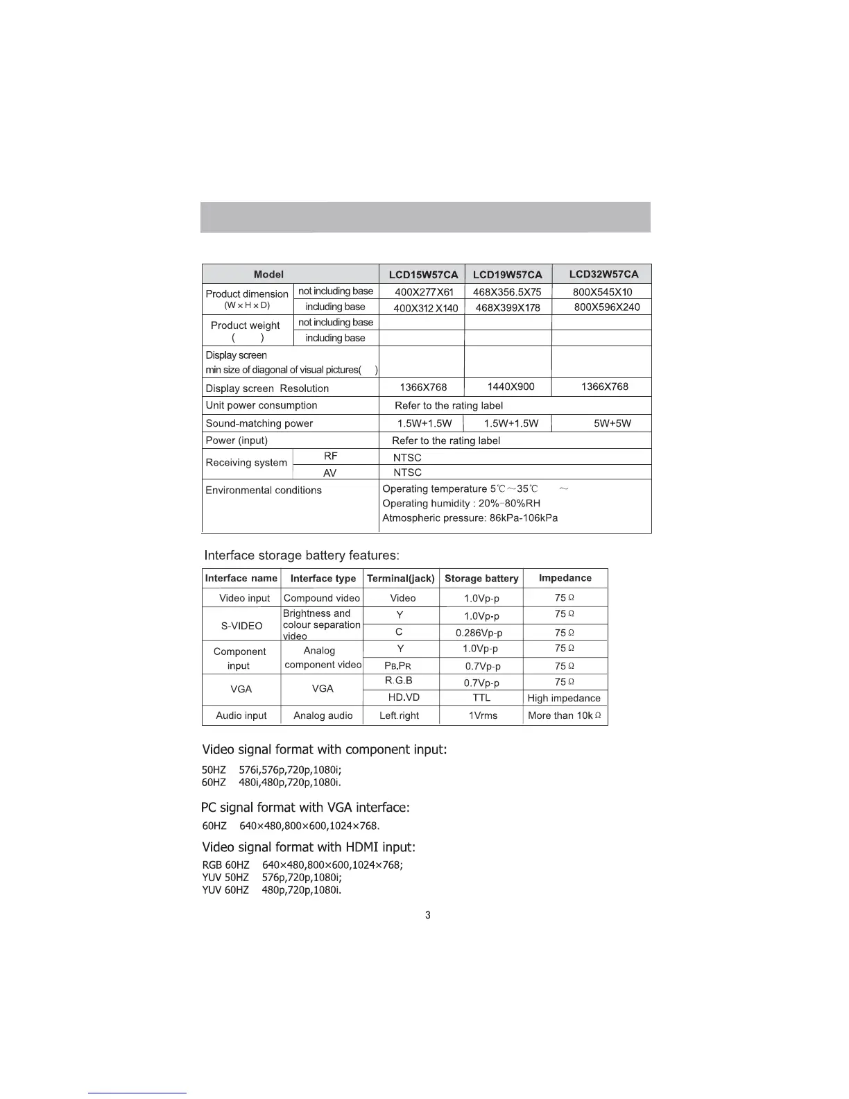 Hisense LCD19W57CA - Specifications; Interface Storage Battery Features
