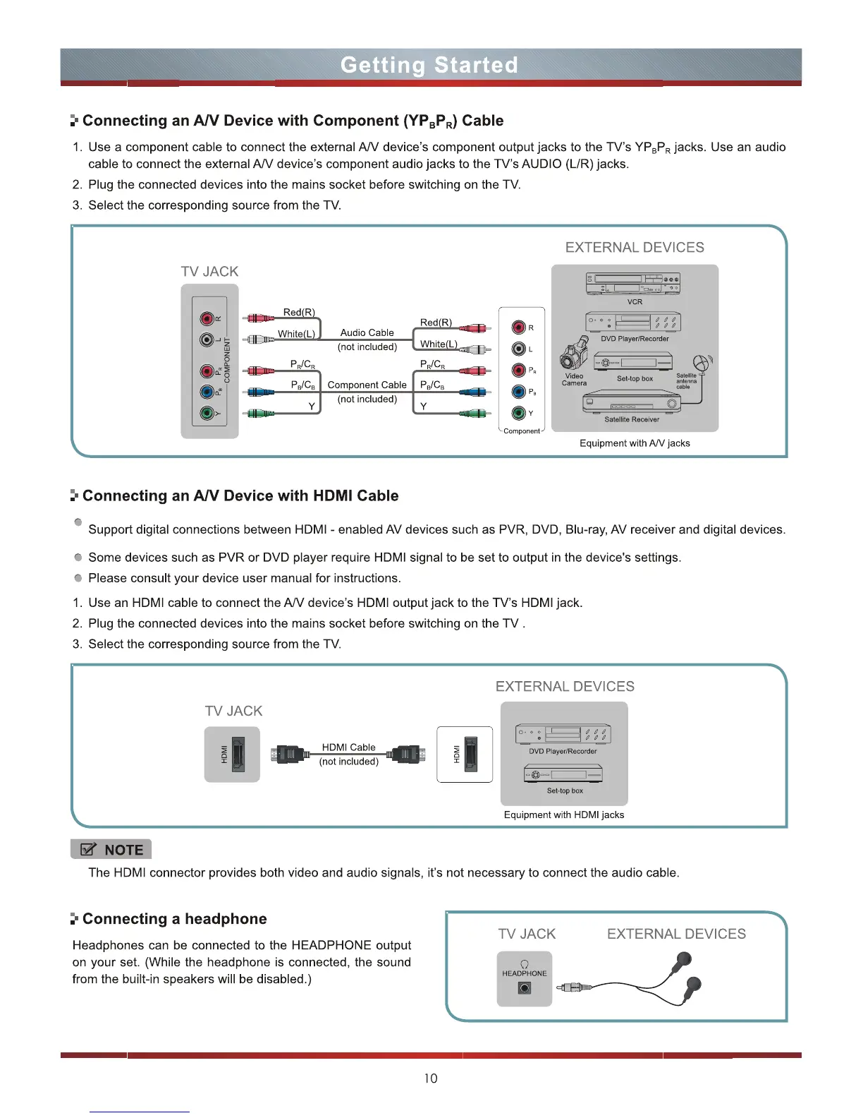 Hisense LTDN46V86US - Getting Started; Connecting an A;V Device with Component (YPBPR) Cable; Connecting an A;V Device with HDMI Cable; Connecting a headphone