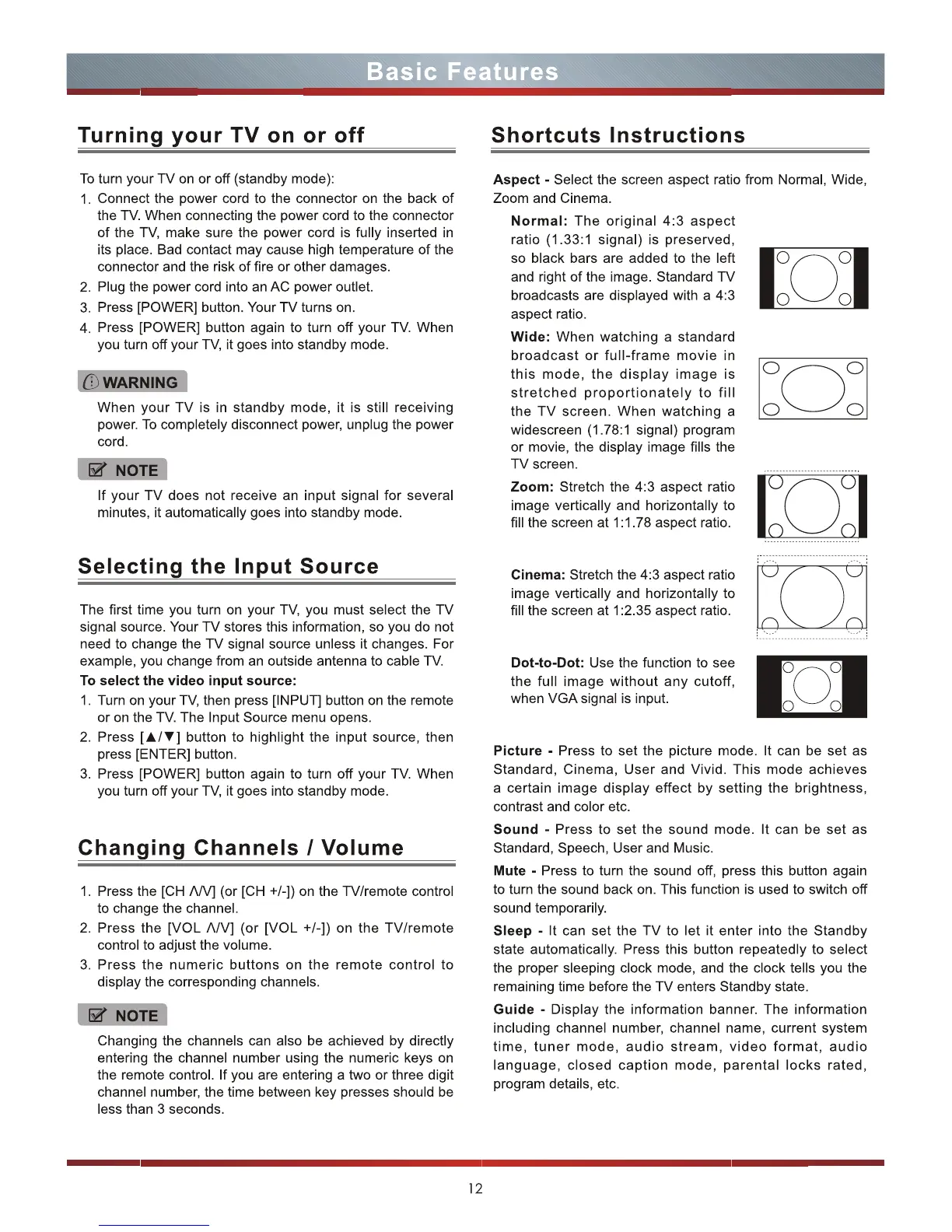 Hisense LTDN46V86US - Basic Features; Turning your TV on or off; Selecting the Input Source; Shortcuts Instructions