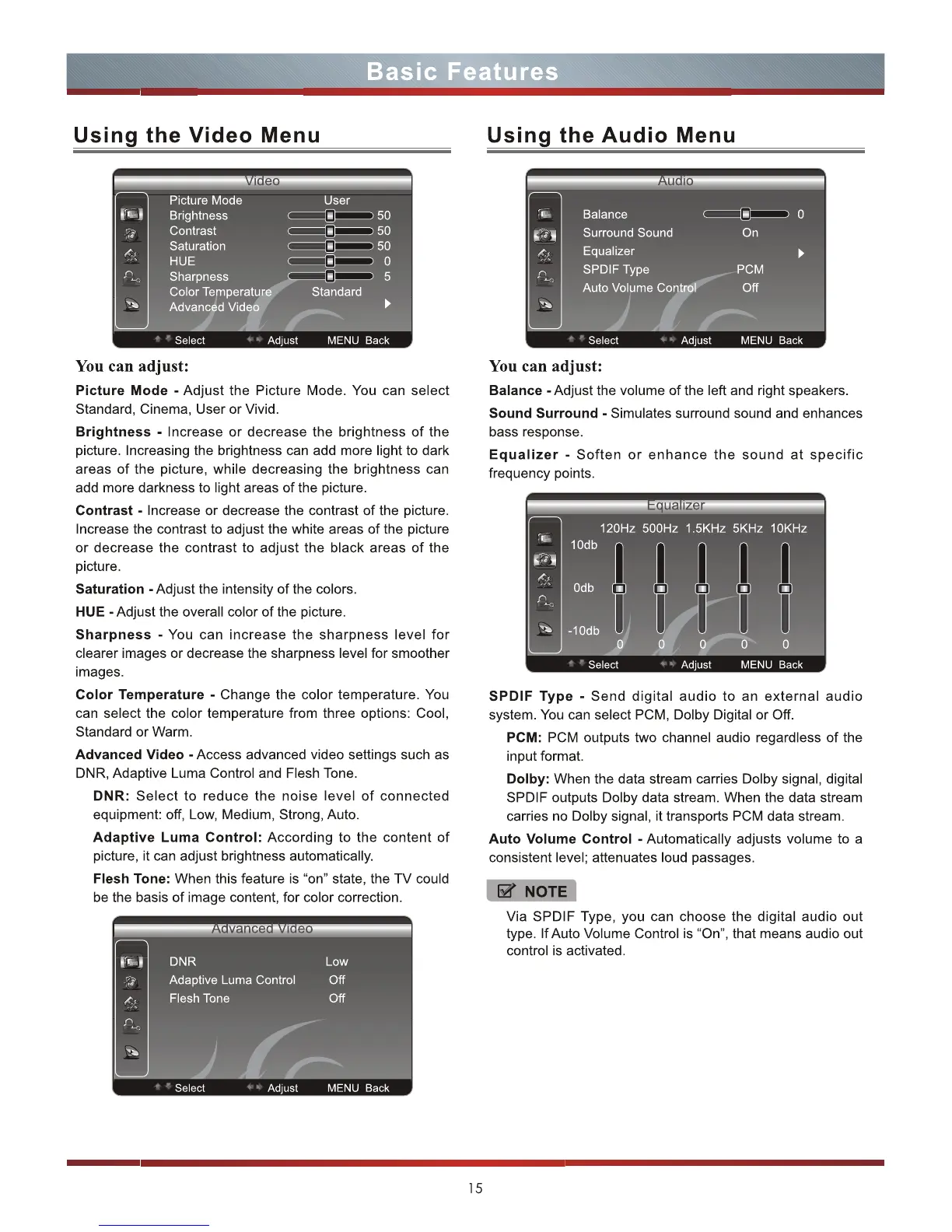Hisense LTDN46V86US - Basic Features; Using the Video Menu; Using the Audio Menu