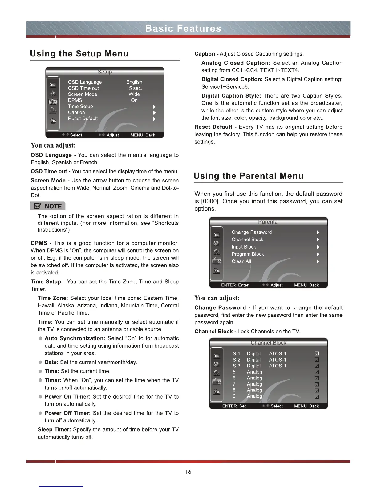 Hisense LTDN46V86US - Basic Features; Using the Setup Menu; Using the Parental Menu