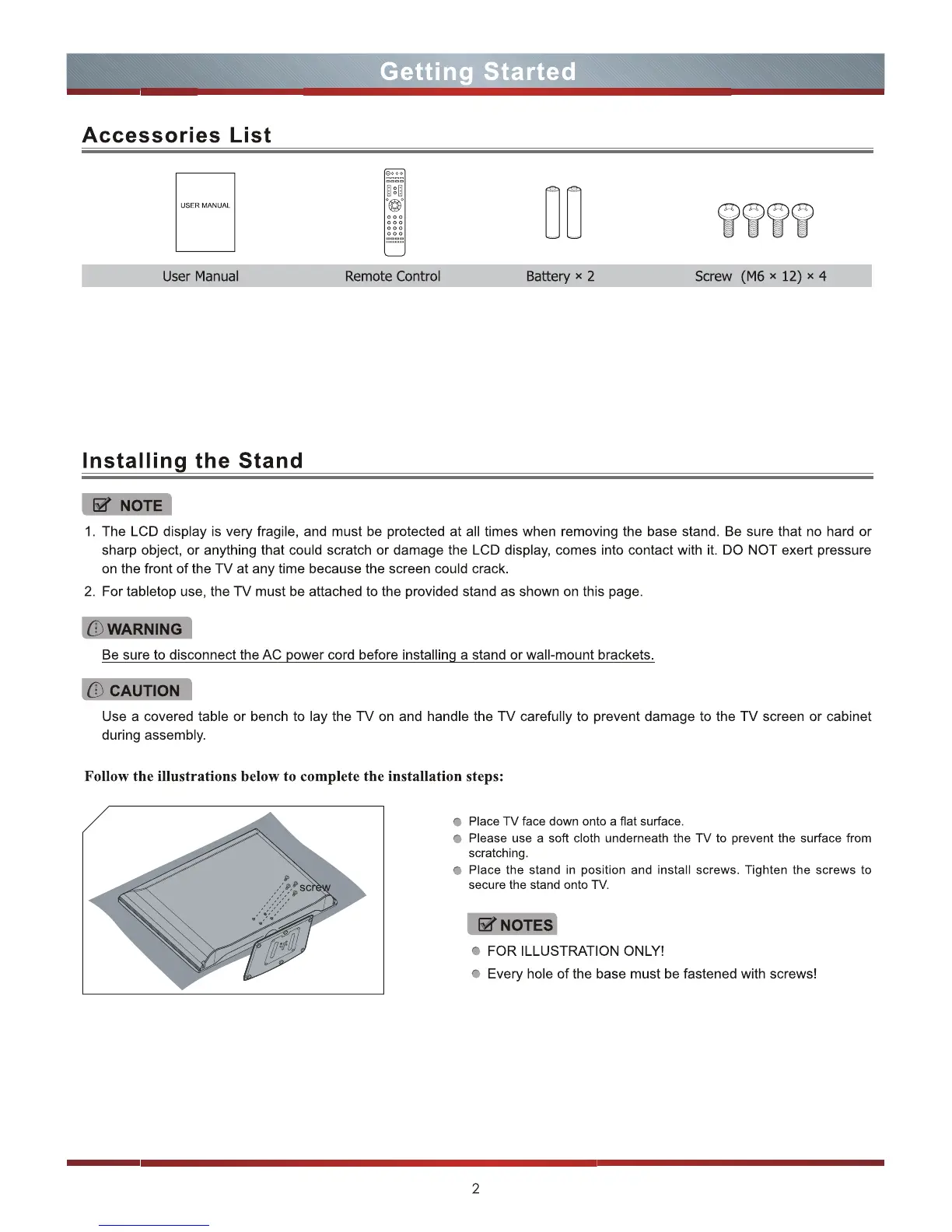 Hisense LTDN46V86US - Getting Started; Accessories List; Installing the Stand