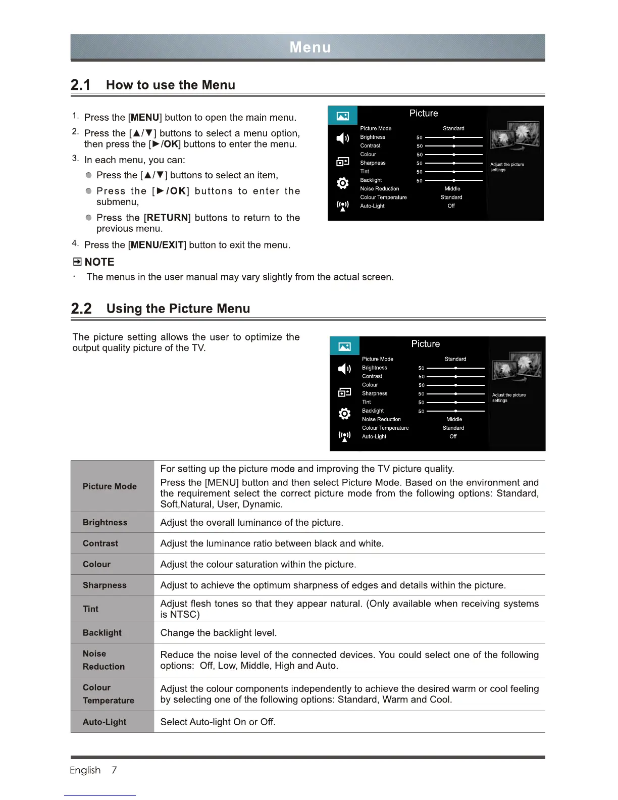 Hisense LTDN50D36TUK - Menu; Picture Menu Settings