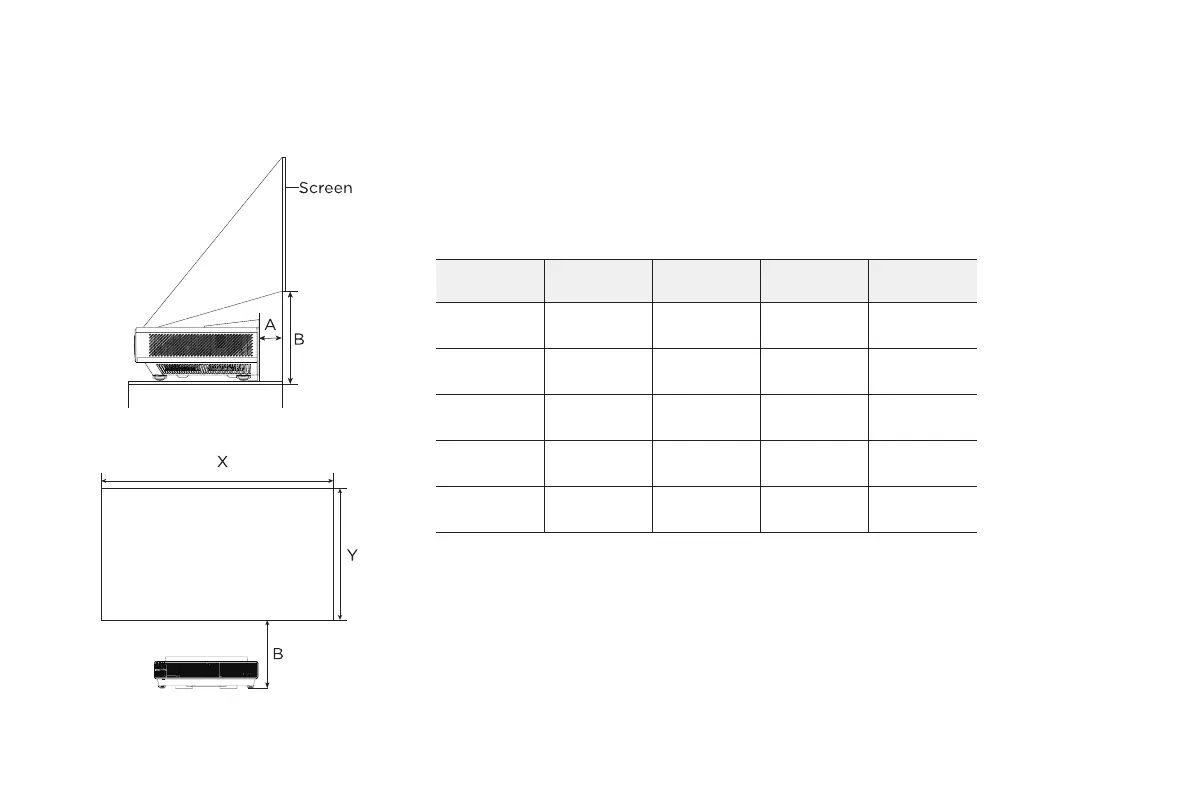 NOTE: The sizes of the screen for each projection distance may differ depending on the actual installation environment