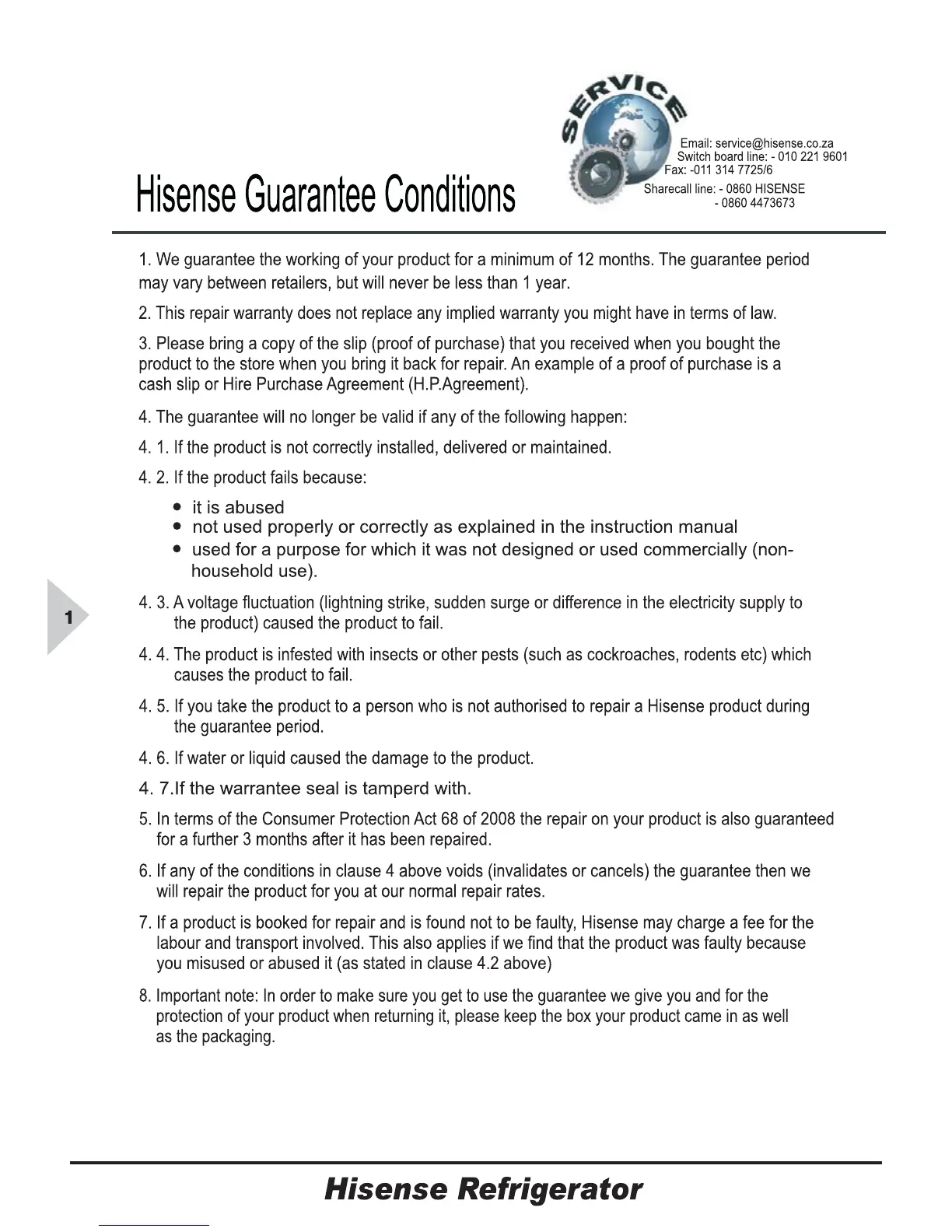 Hisense RC-76WS4S - Hisense Guarantee Conditions