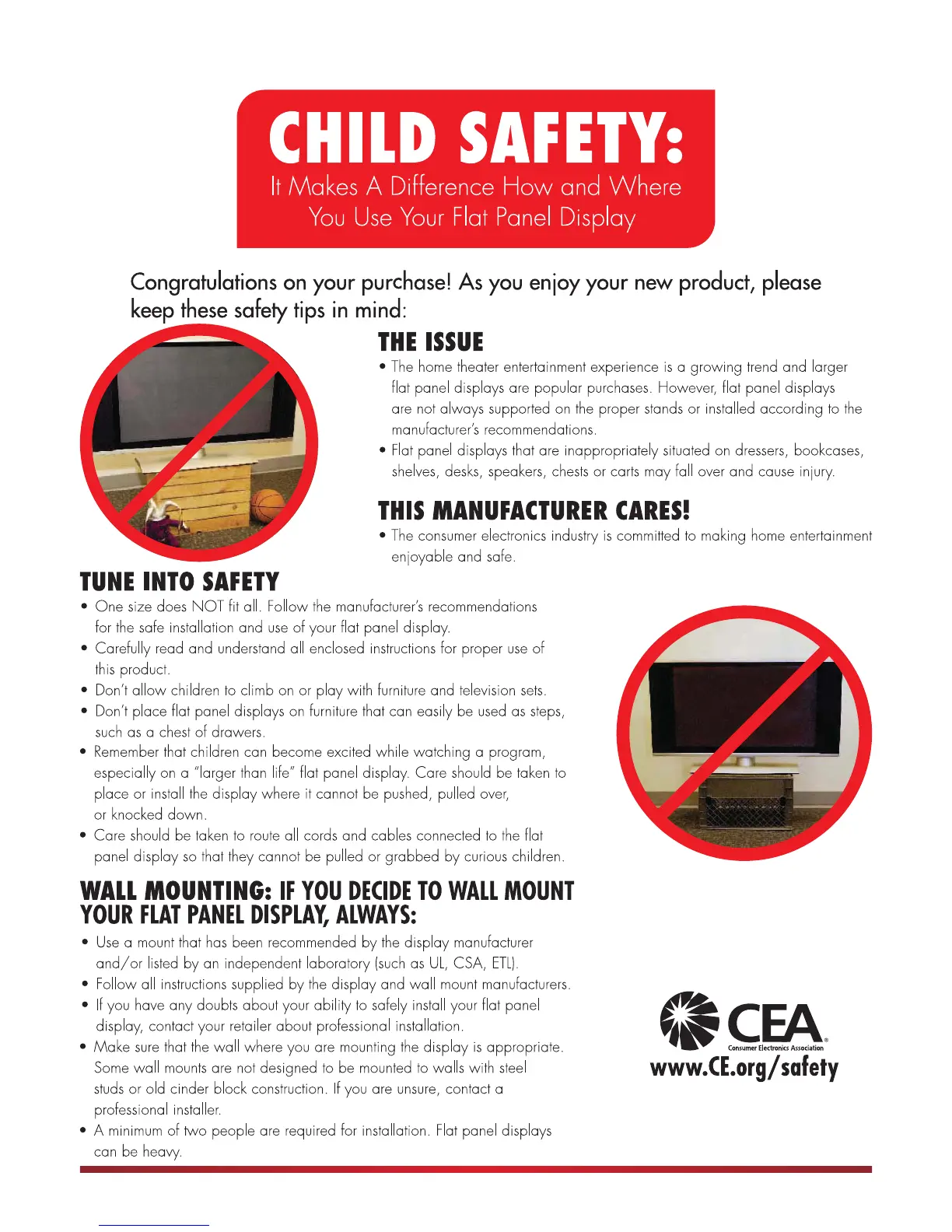 Hisense TV - CHILD SAFETY; TUNE INTO SAFETY; WALL MOUNTING: IF YOU DECIDE TO WALL MOUNT YOUR FLAT PANEL DISPLAY, ALWAYS: