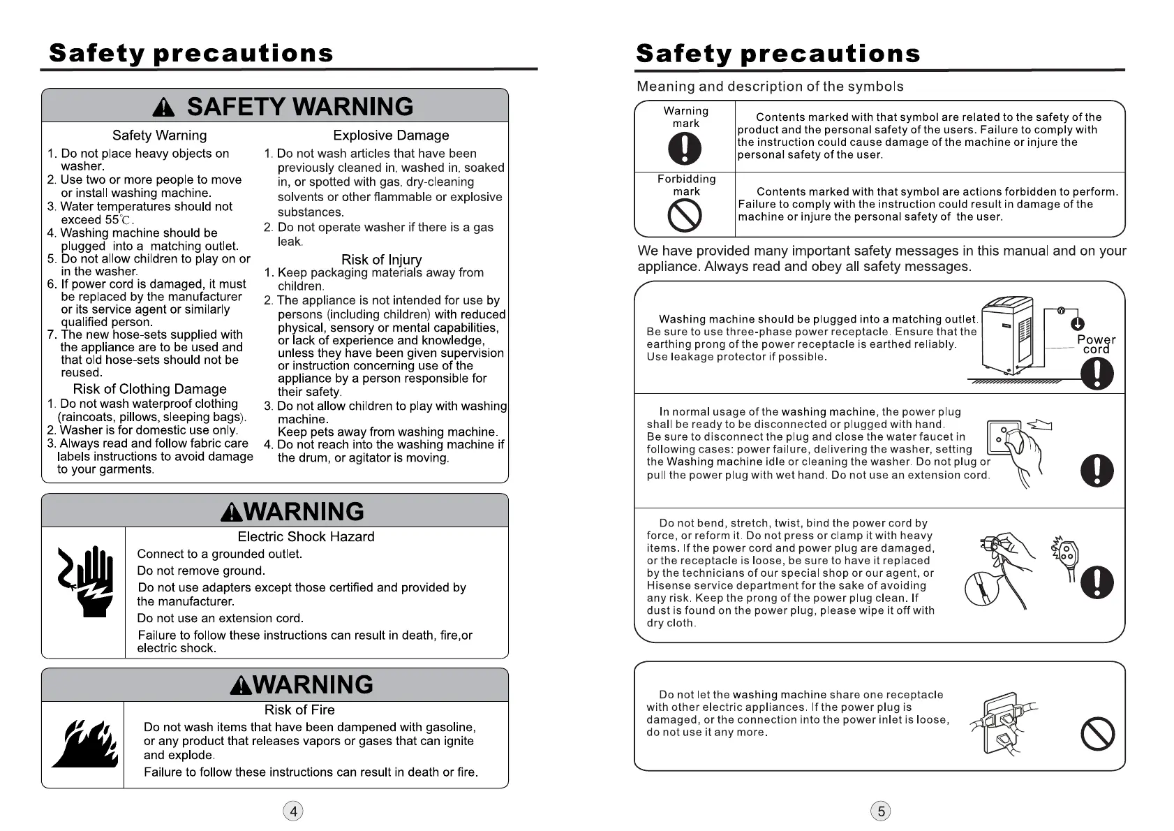 Hisense WTJD802G - Safety Precautions - Warnings; Safety Warnings and Hazards; Safety Symbols Explained