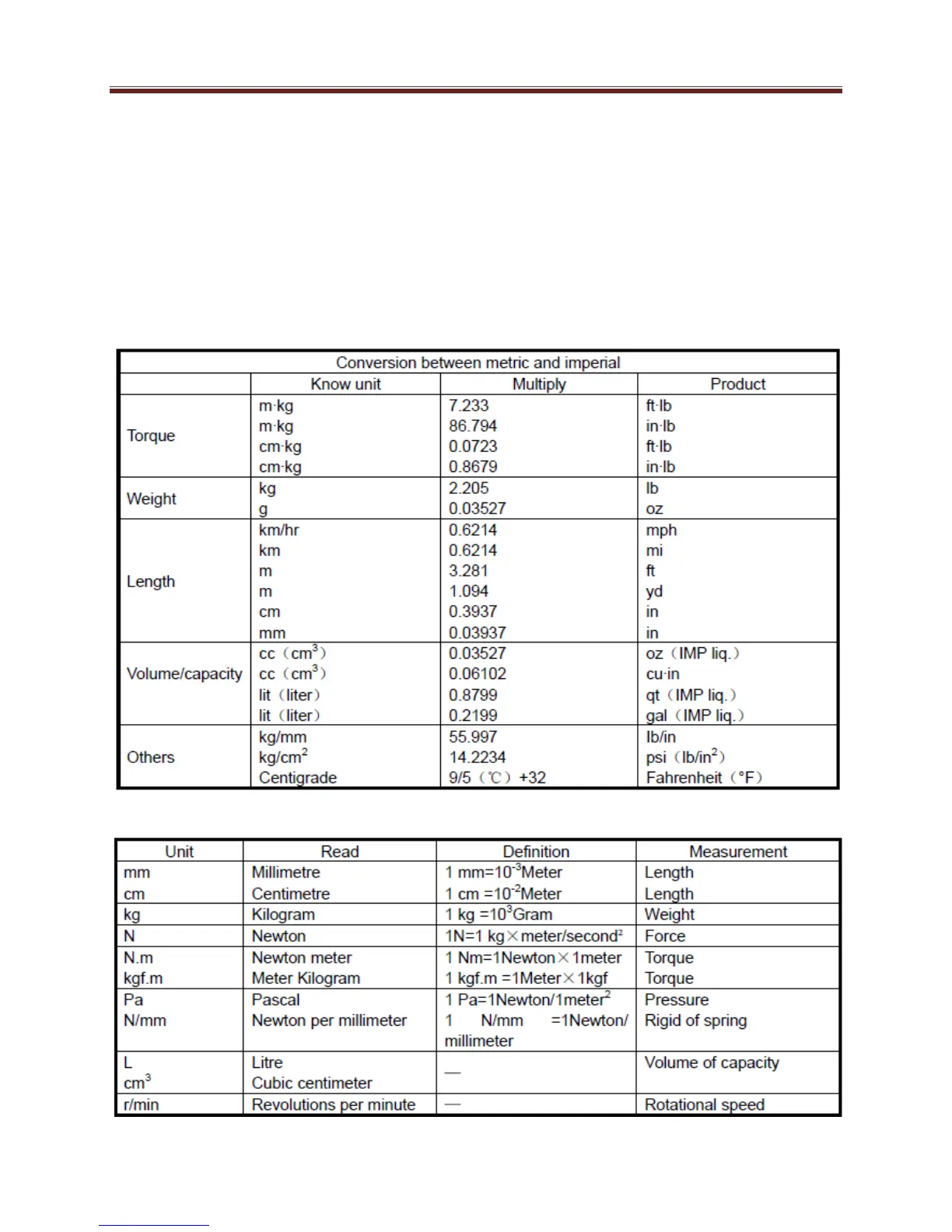 All the specified documents in this manual are taken SI and Metric measurements. With