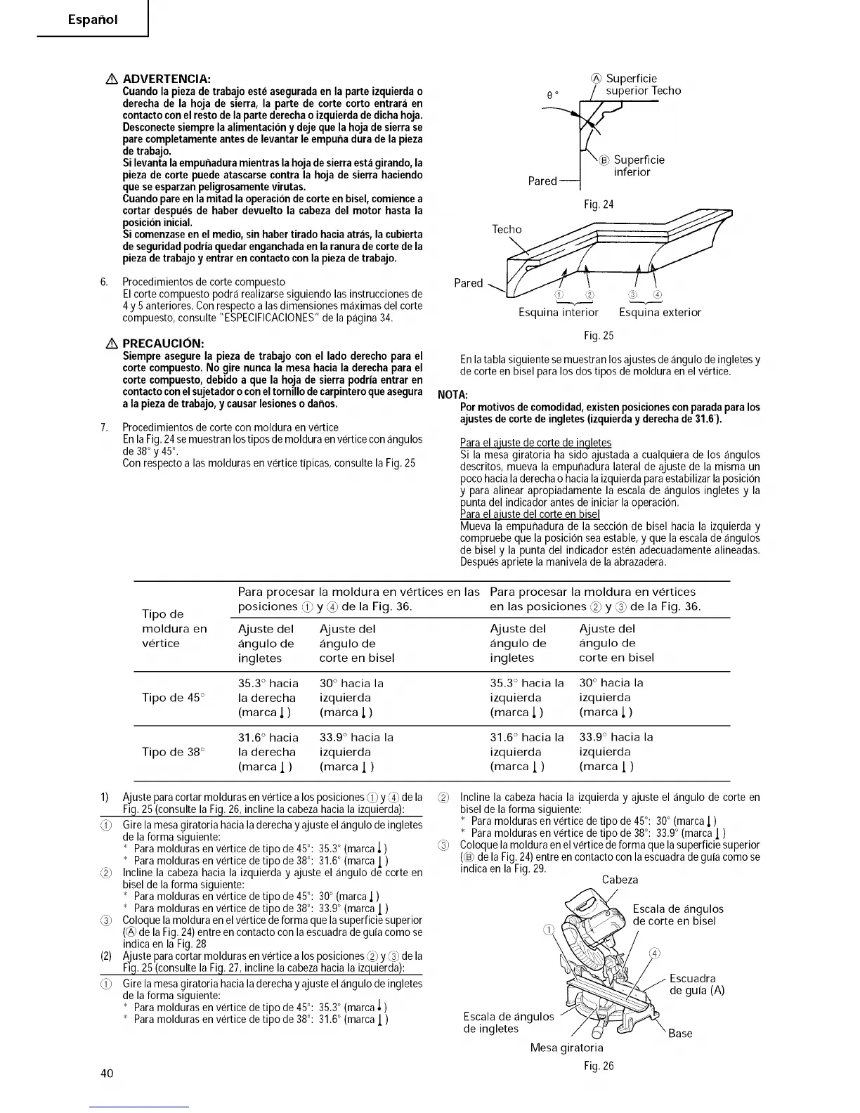 * Para molduras en vertice de tipo de 38°: 31.6° (marca J,)