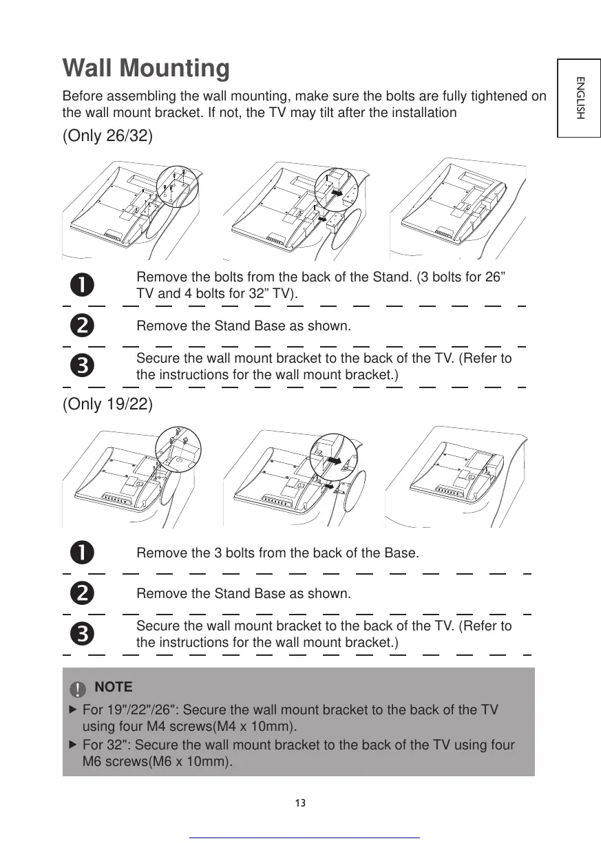 For 19"/22"/26": Secure the wall mount bracket to the back of the TV